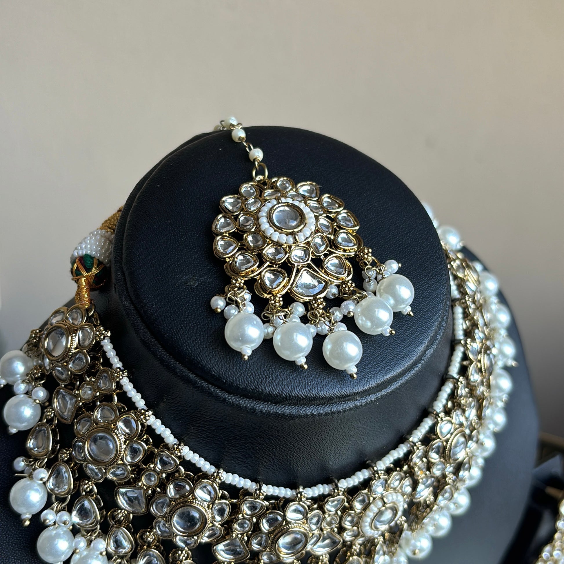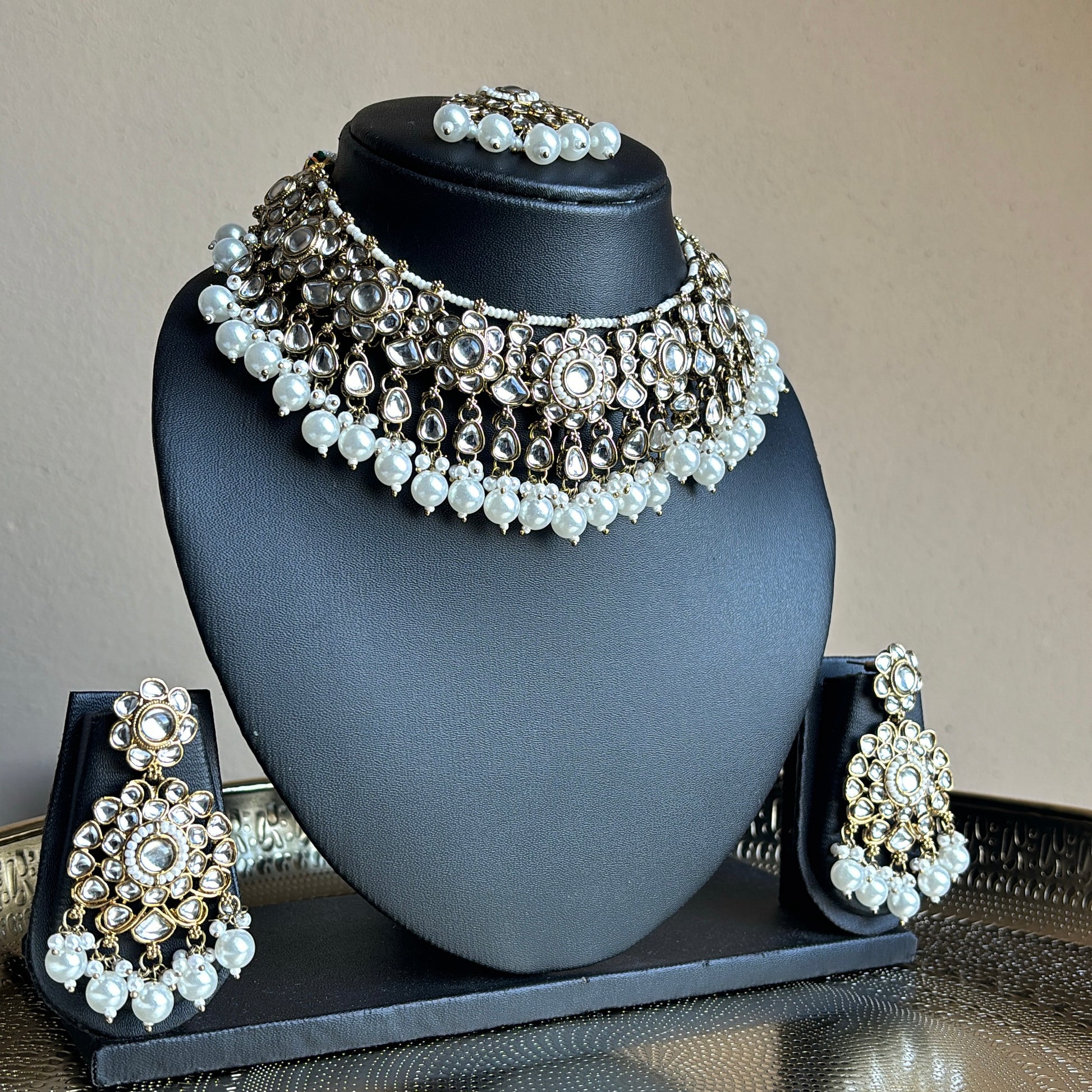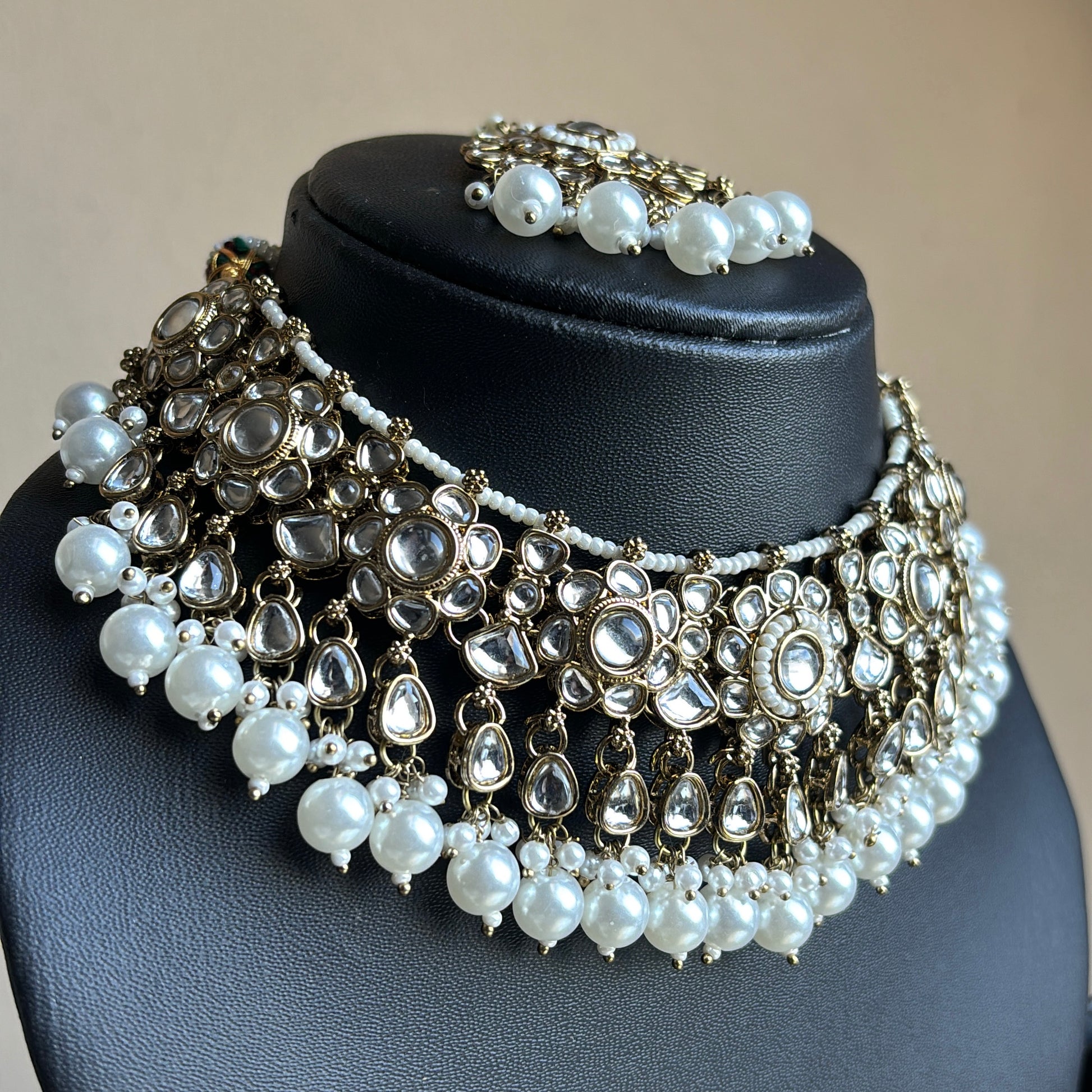 Trending white pearl kundan short necklace/choker with matching earrings and tikka