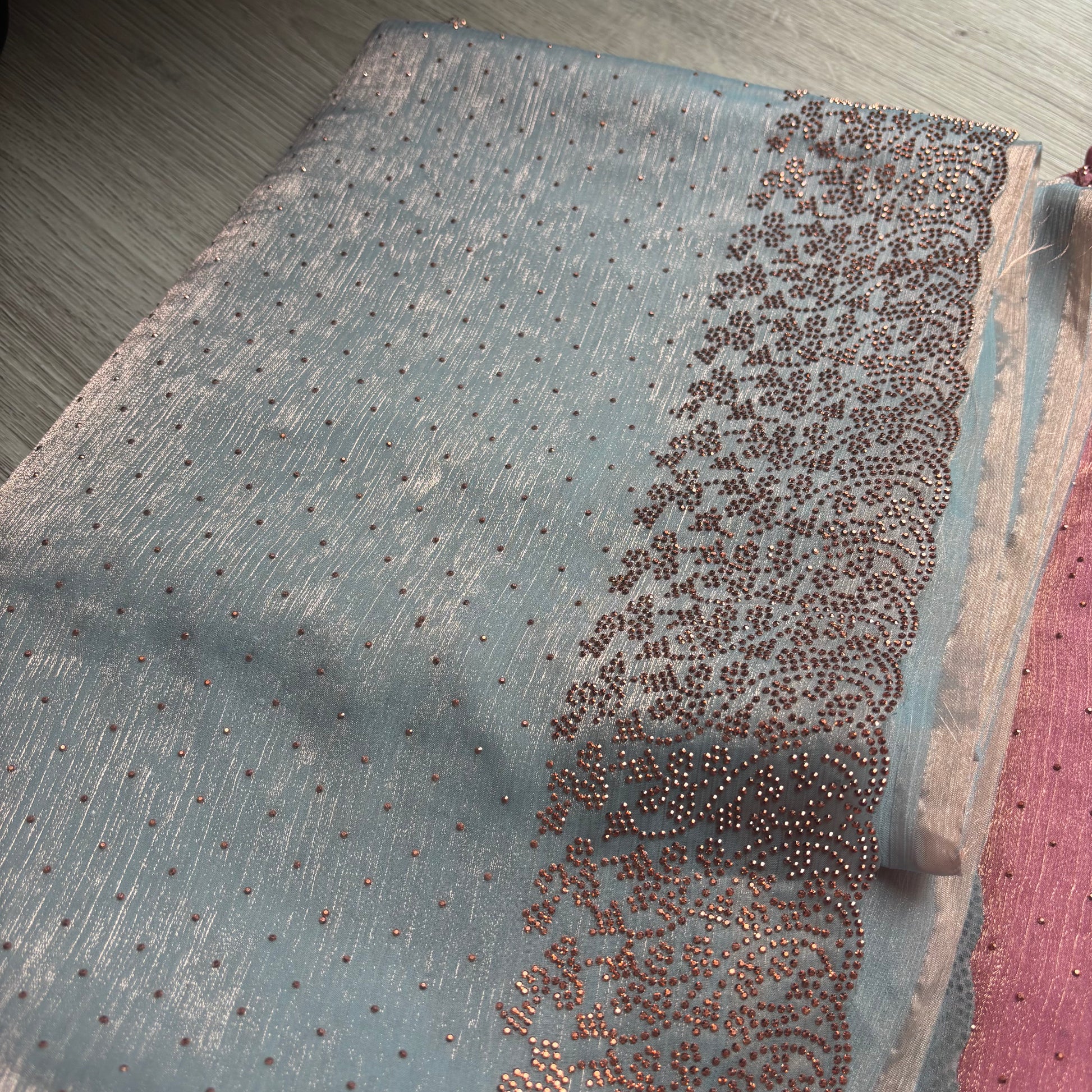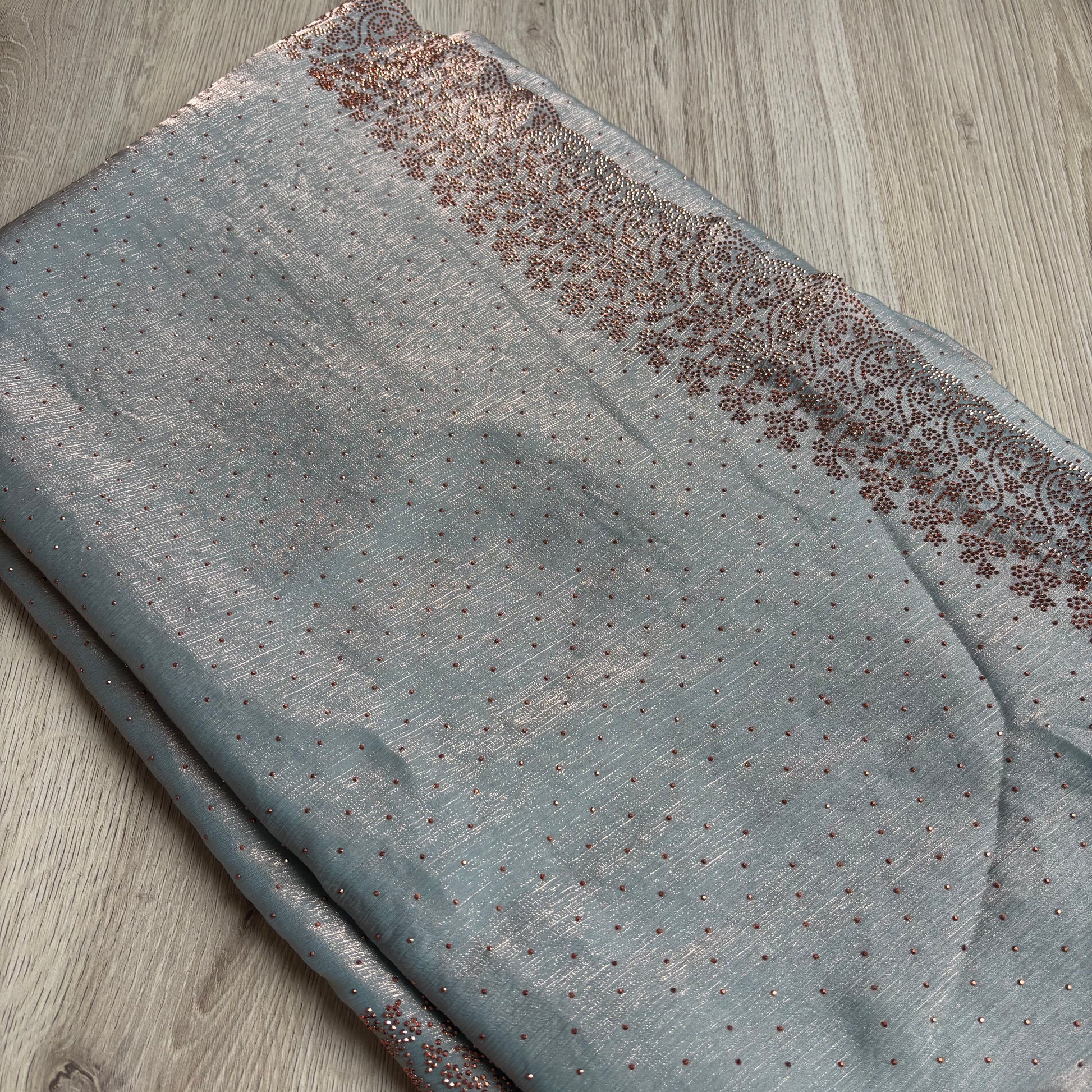 Greyish blue party wear saree with stone work. Comes with matching unstitched blouse material.