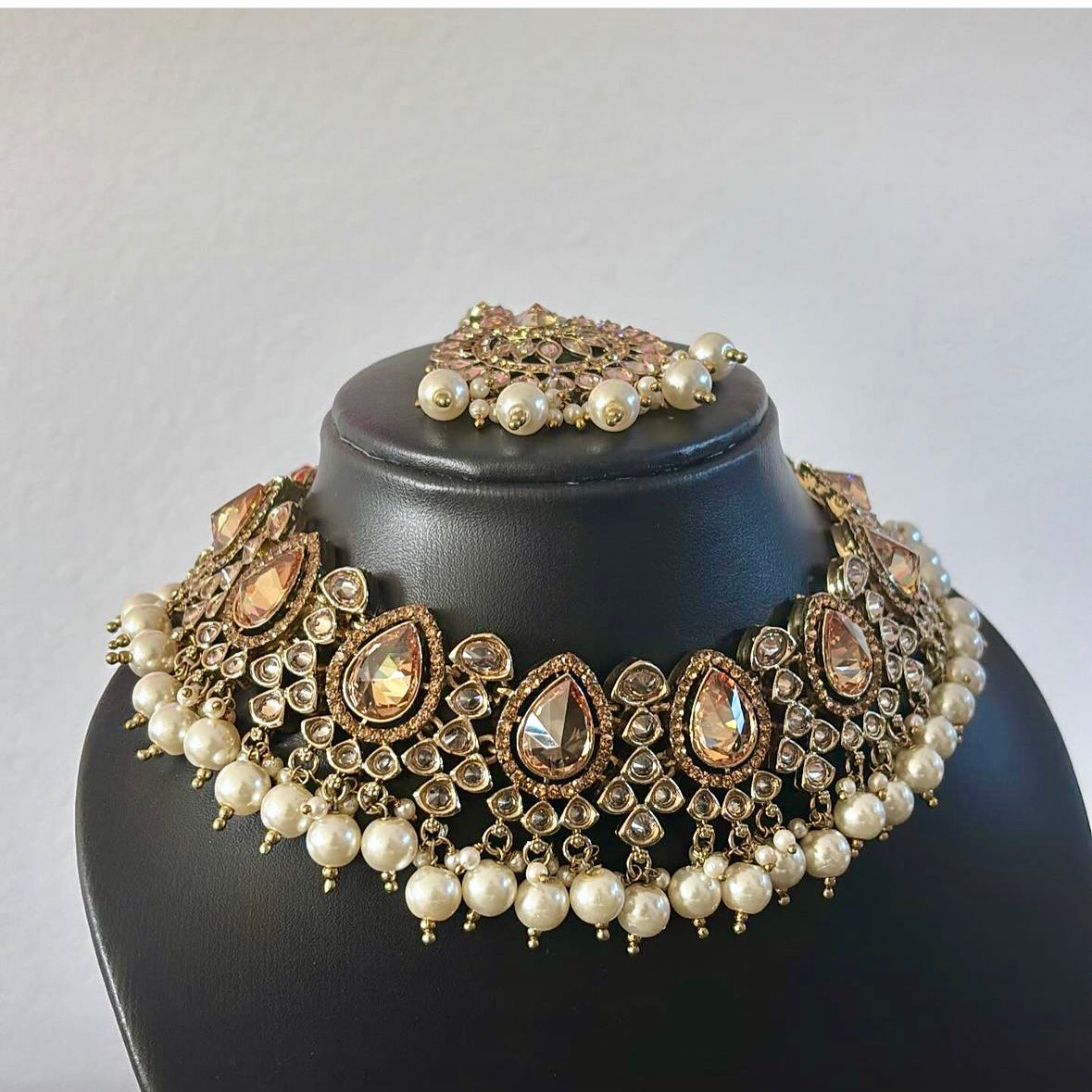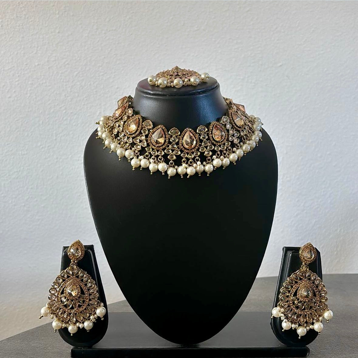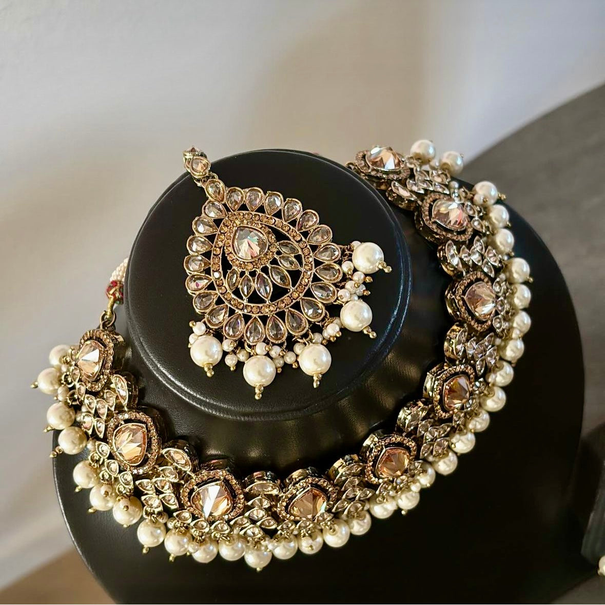 Our bestselling antique gold short necklace/choker with matching statement earrings and tikka