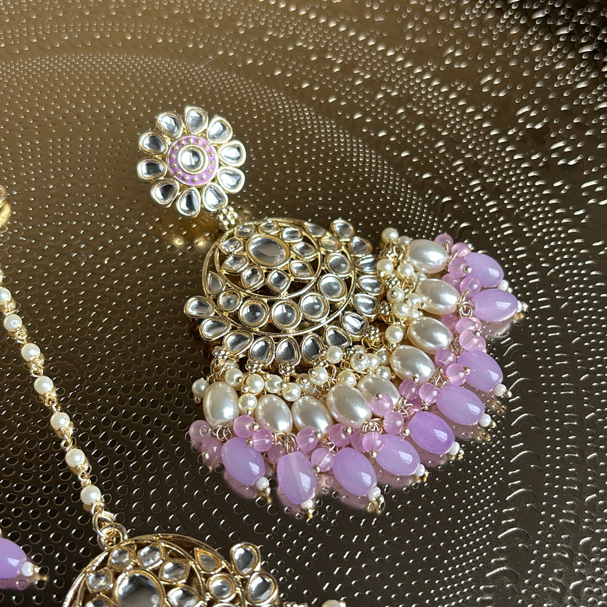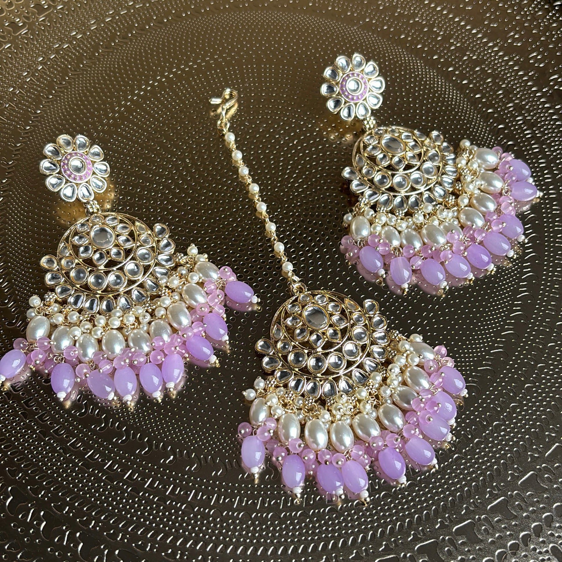 Trending kundan stones lavender white pearl statement earrings with matching tikka