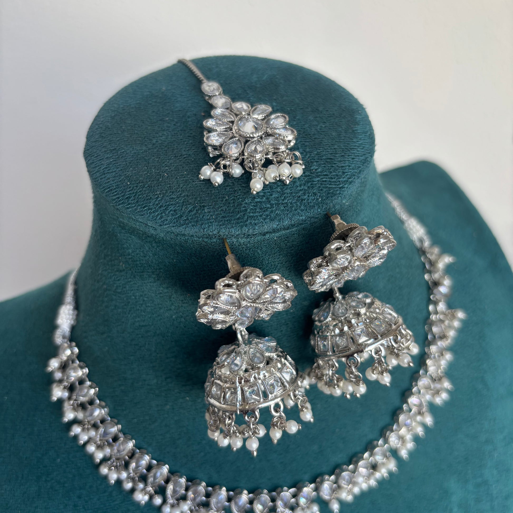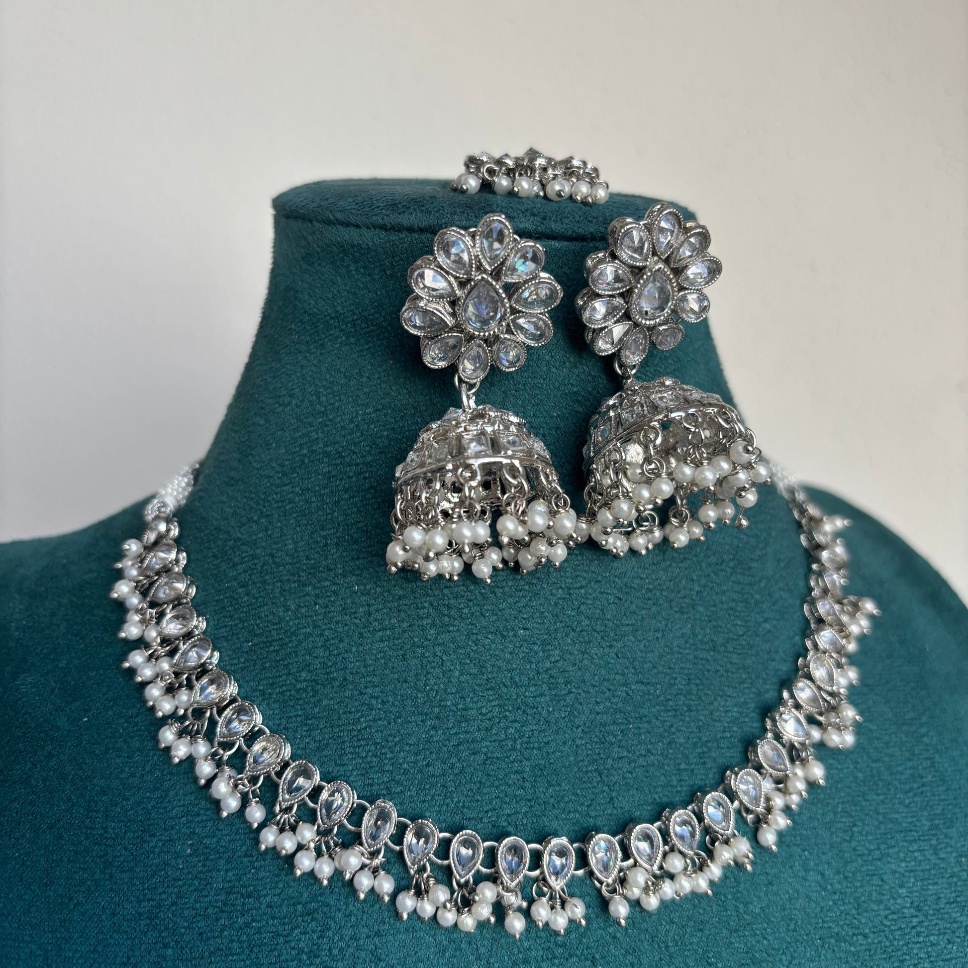 Trending silver polish pearl necklace with jhumkas and tikka