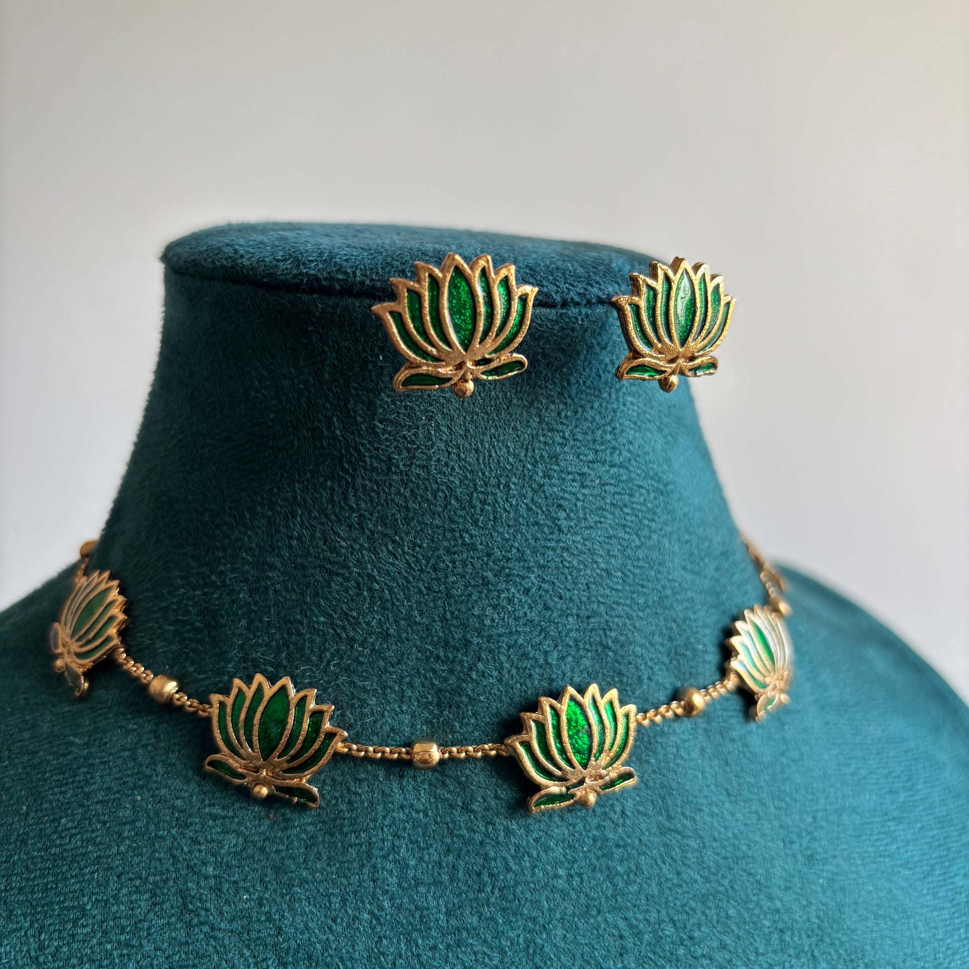 Trending green lotus style necklace/choker with matching green lotus style earrings