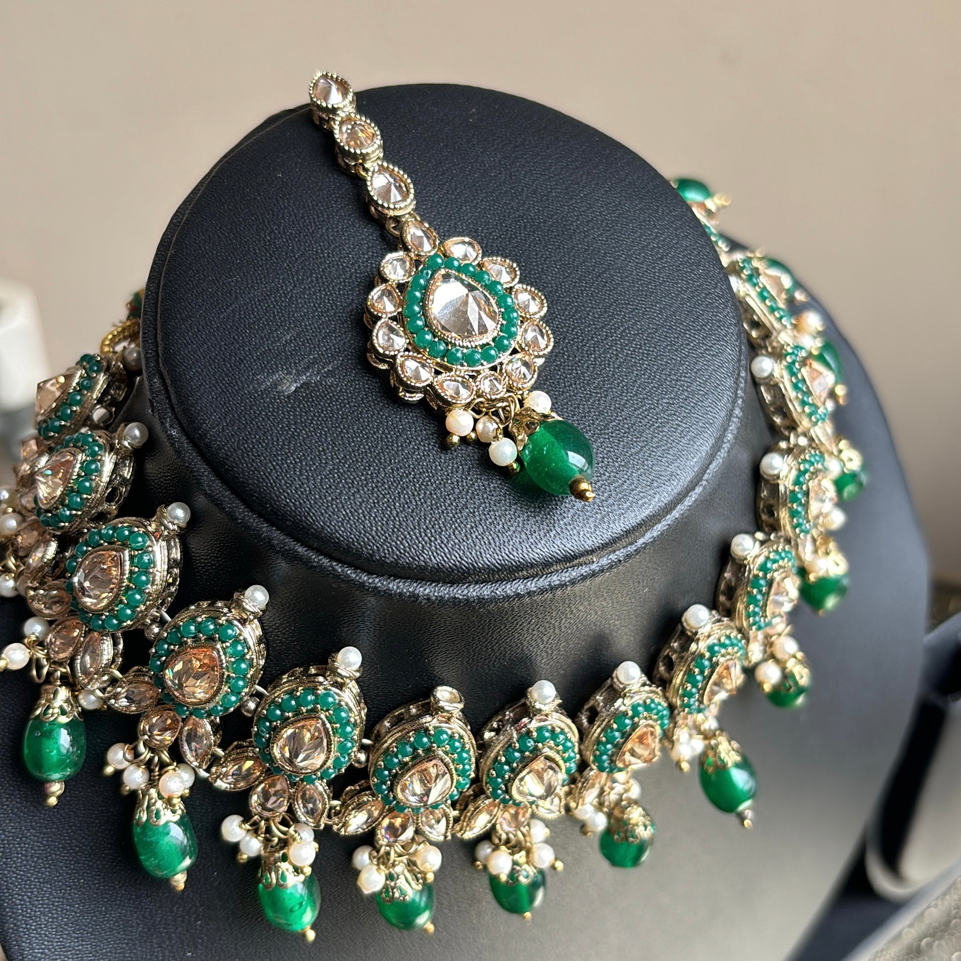 Trending dark green short necklace/choker with matching jhumkas and tikka