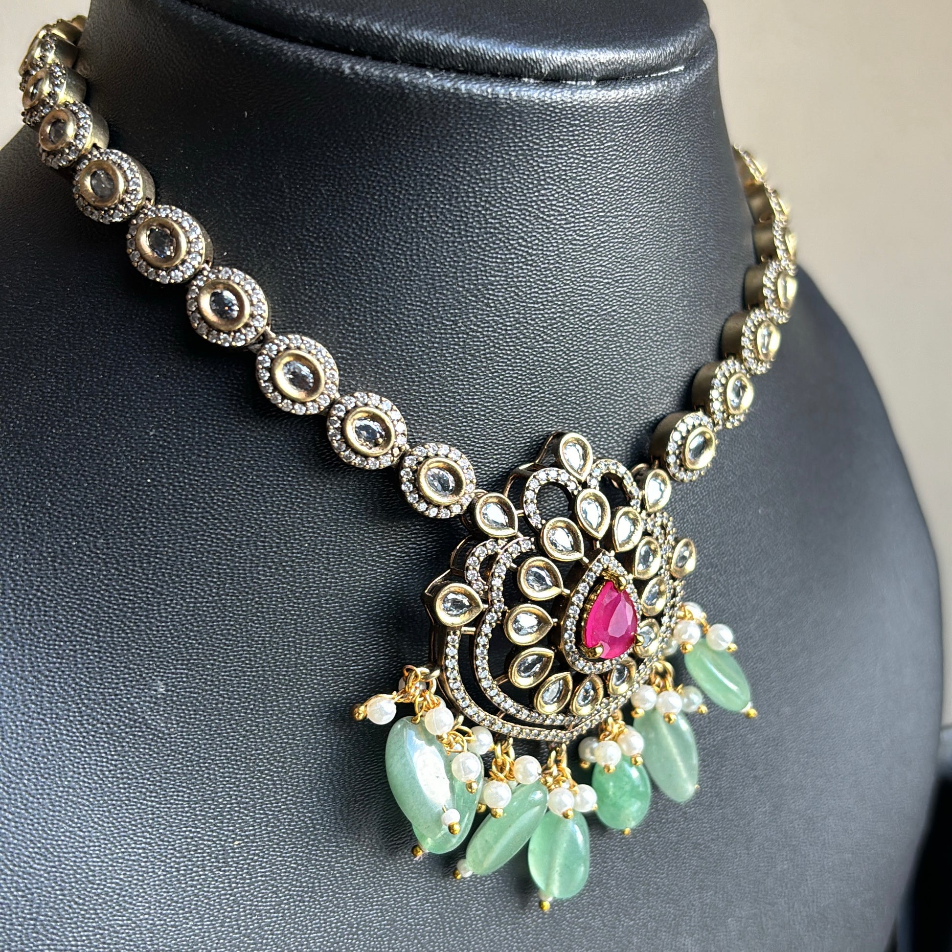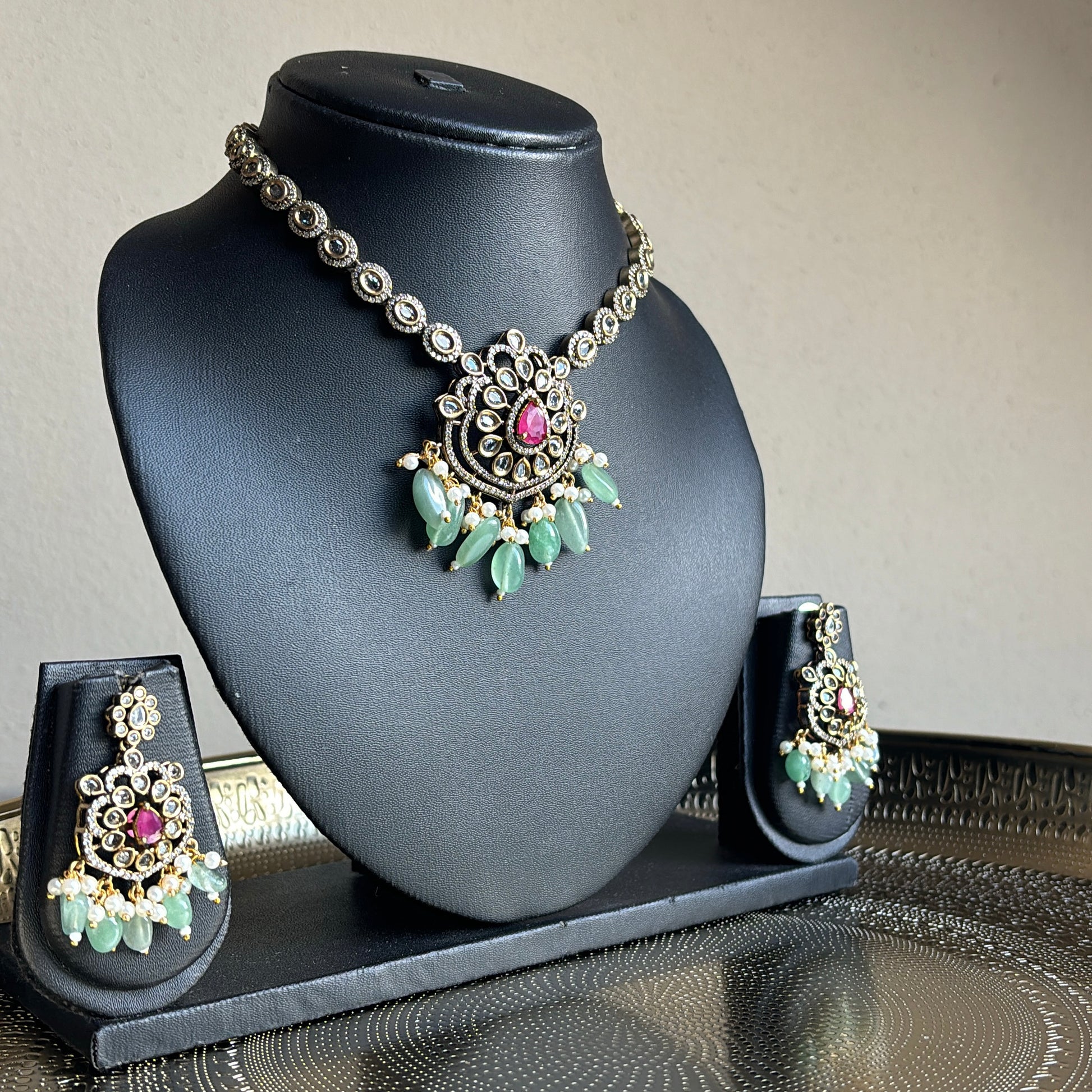 Exclusive 4 in 1 stone Victorian short necklace with mint beads comes with matching earrings