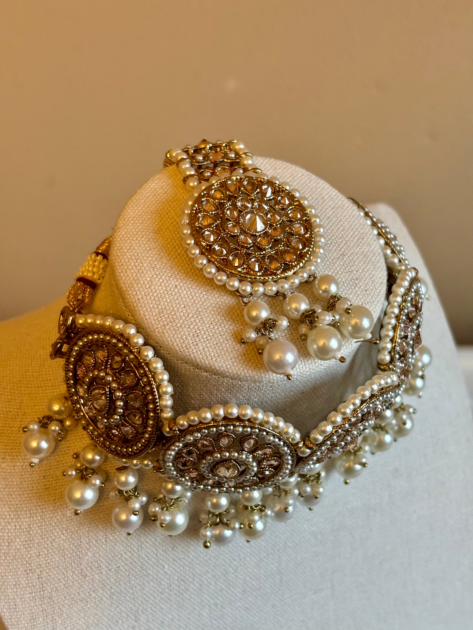 Exclusive antique gold choker with matching statement studs and tikka