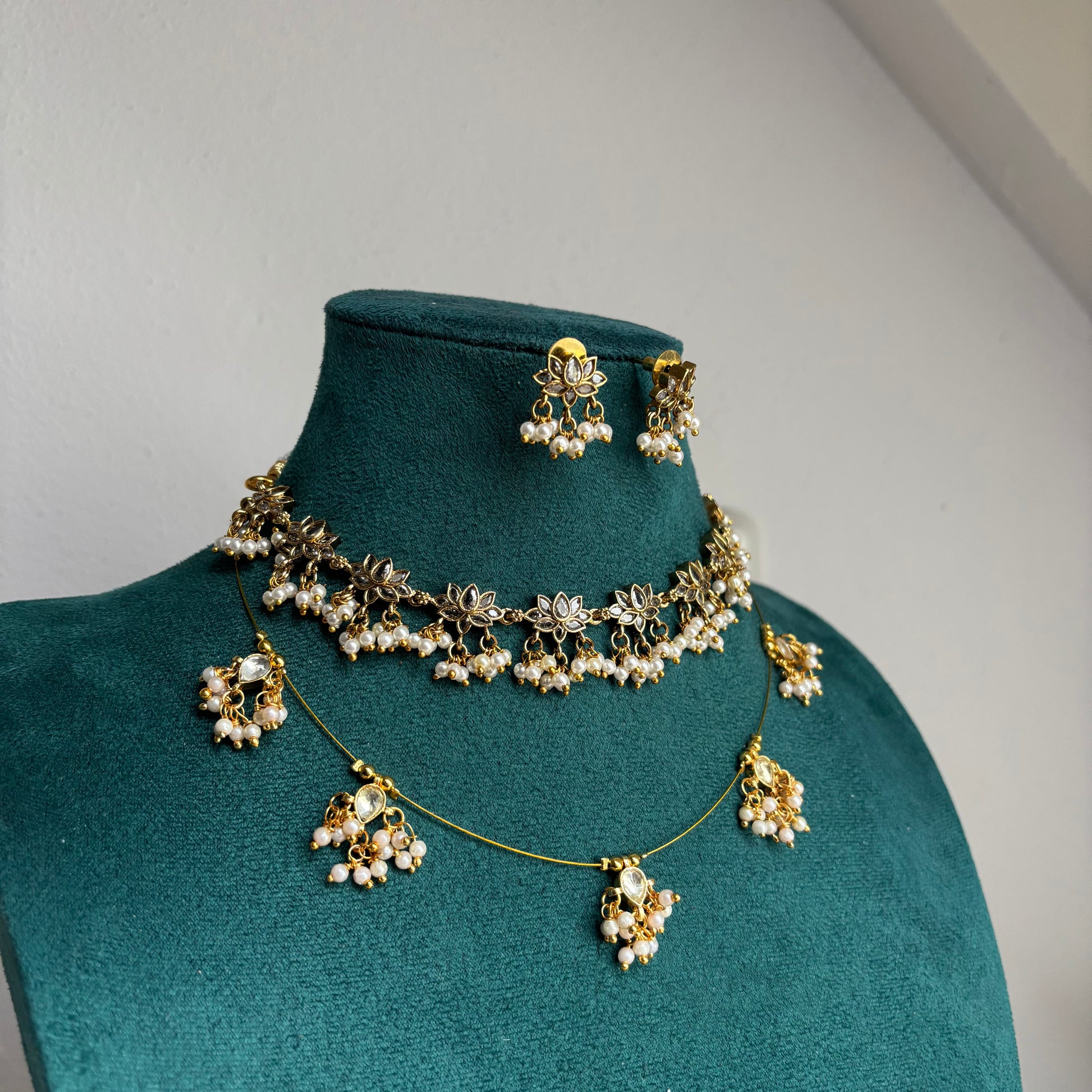 Trending lotus design pearl necklace with invisible stone necklaces comes with matching earrings