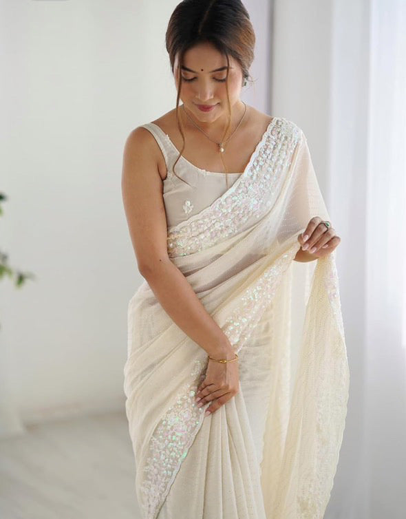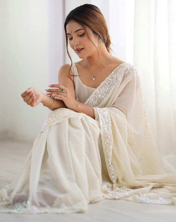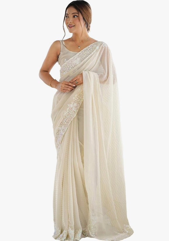Trending off white saree with embroidery work comes with matching unstitched blouse