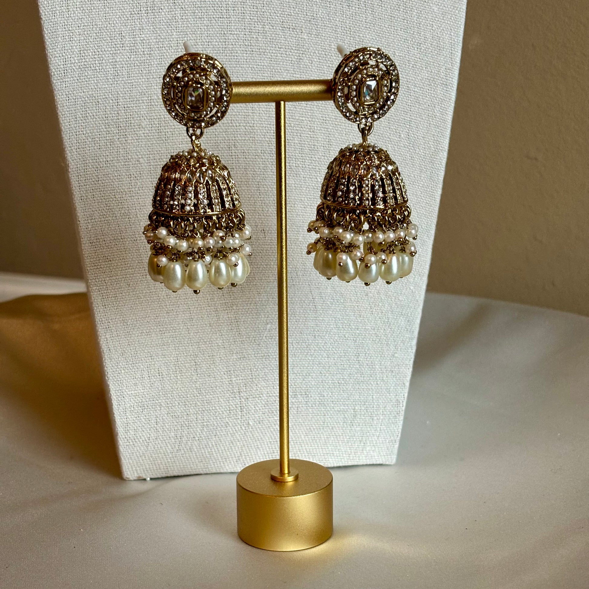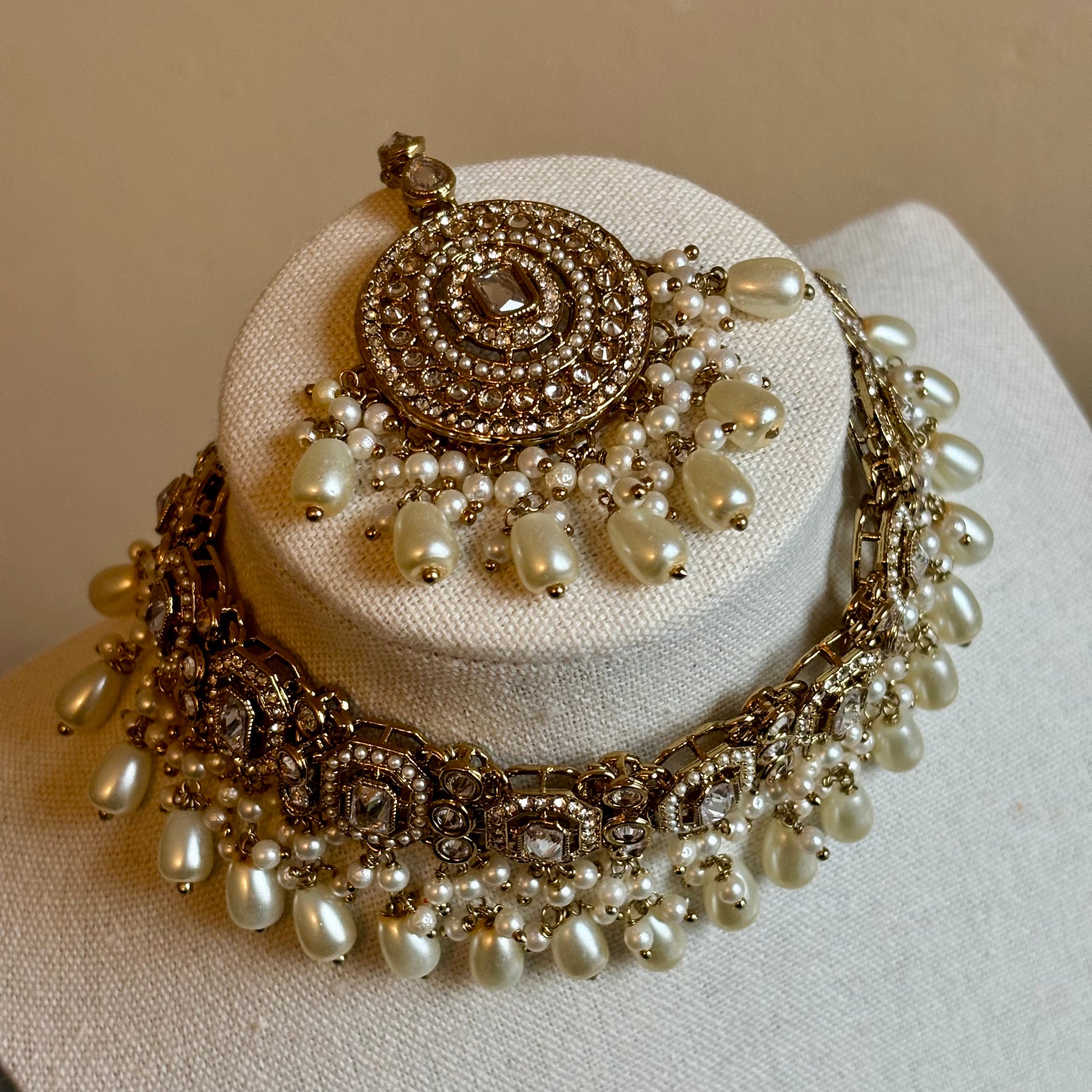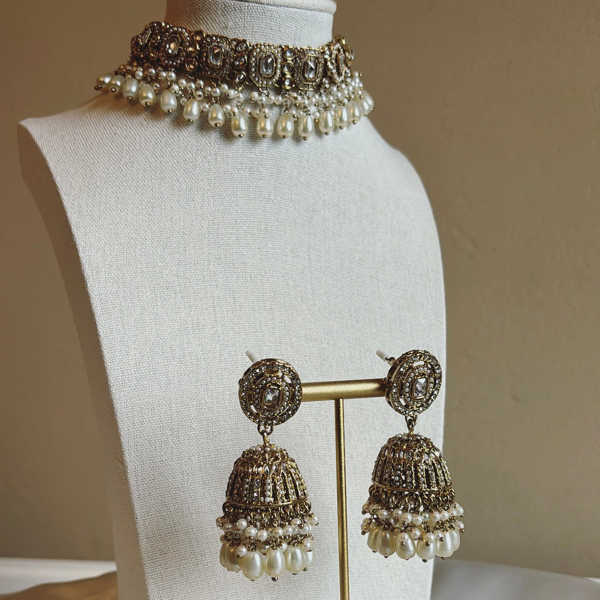 Exclusive white bead antique gold choker with matching statement jhumkas and tikka