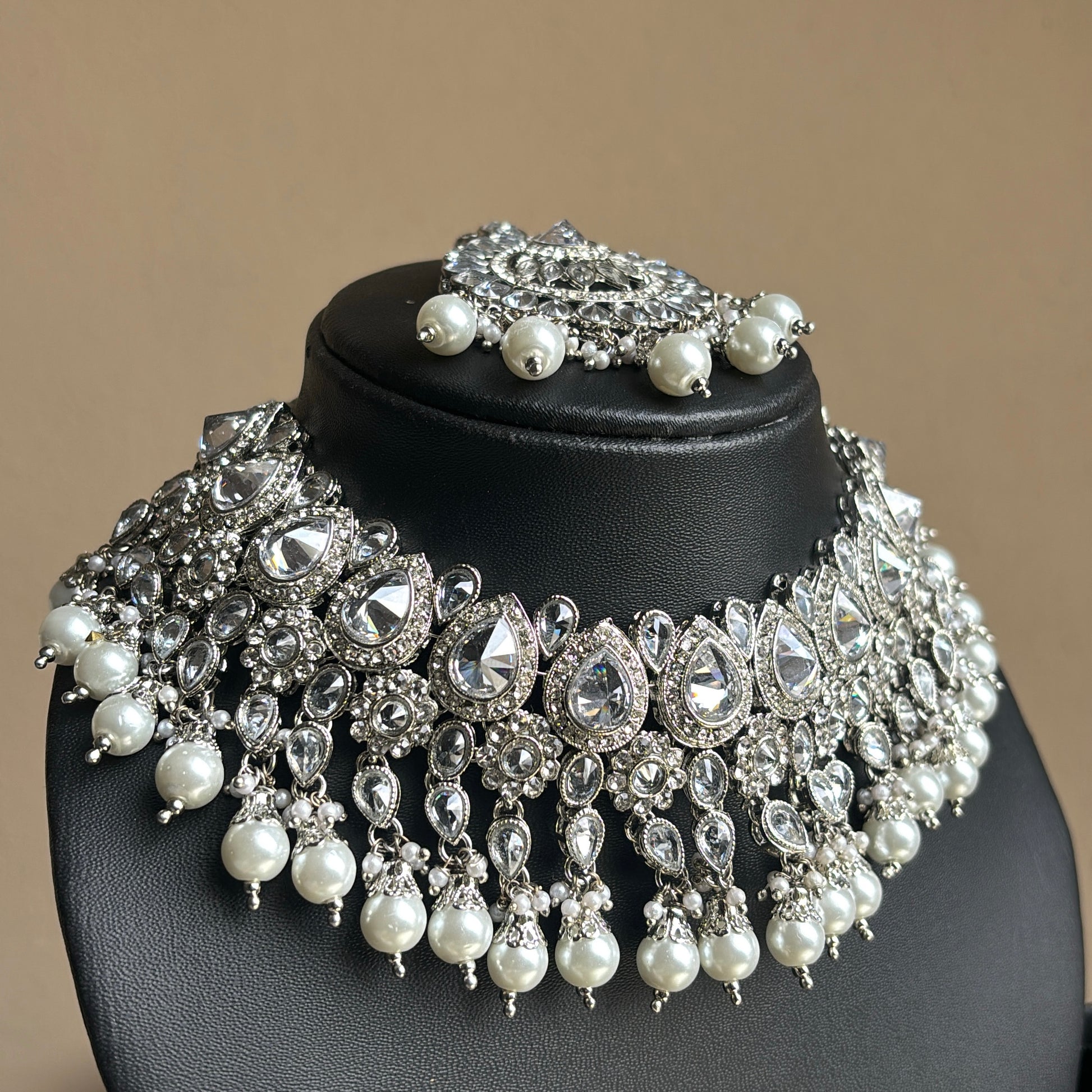 Bestselling silver short necklace/choker with matching statement jhumkas and tikka