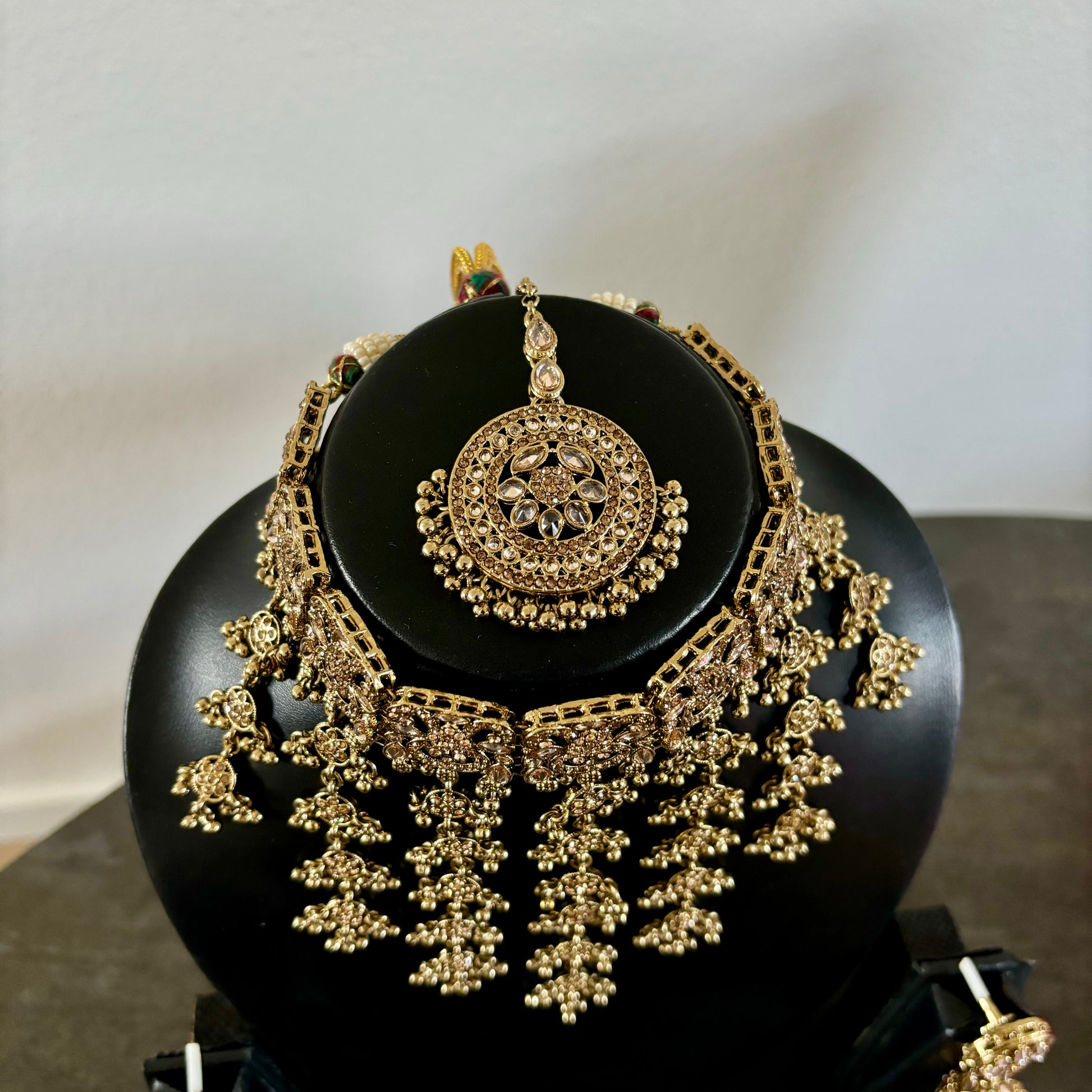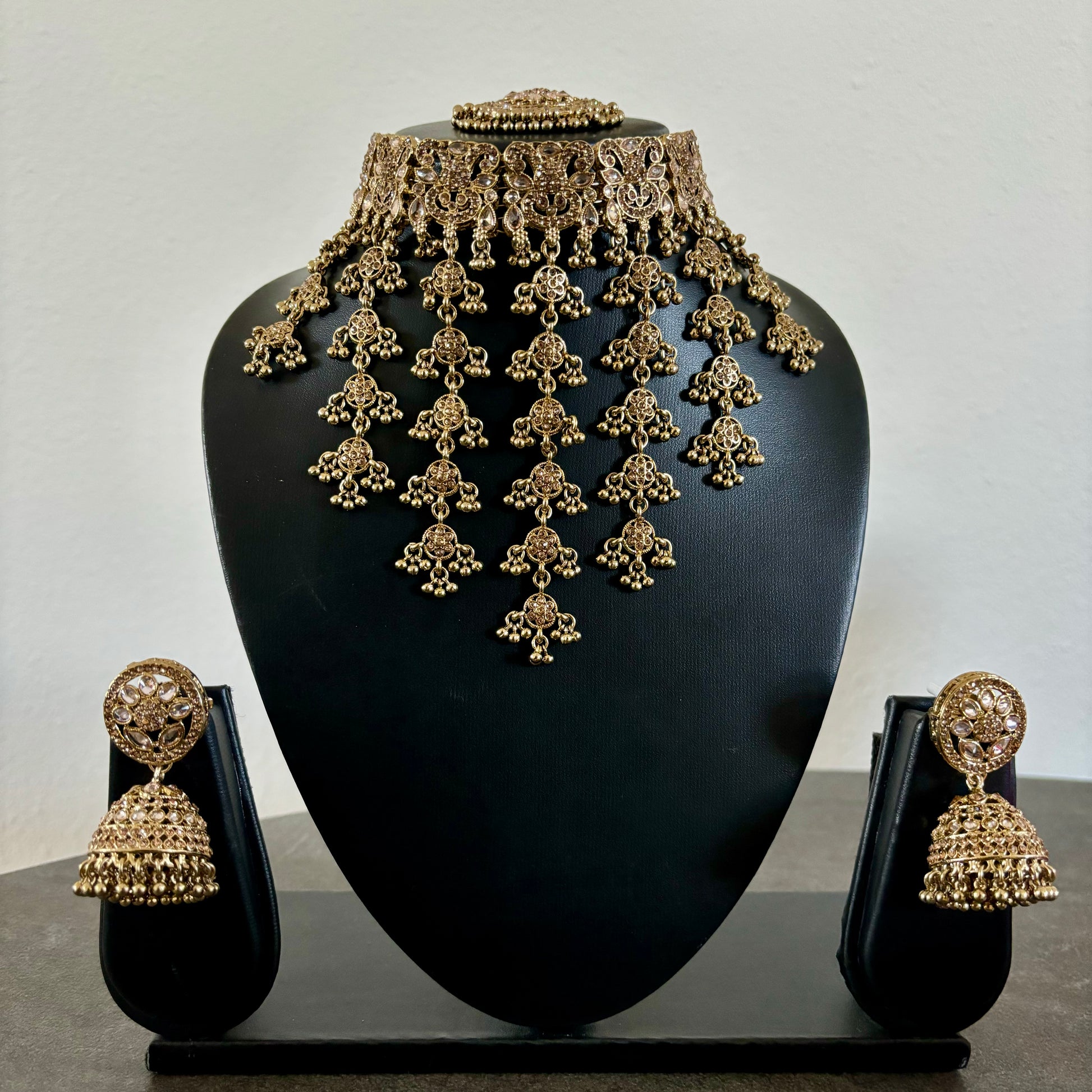 Exclusive gold pearl statement necklace with matching jhumkas and tikka