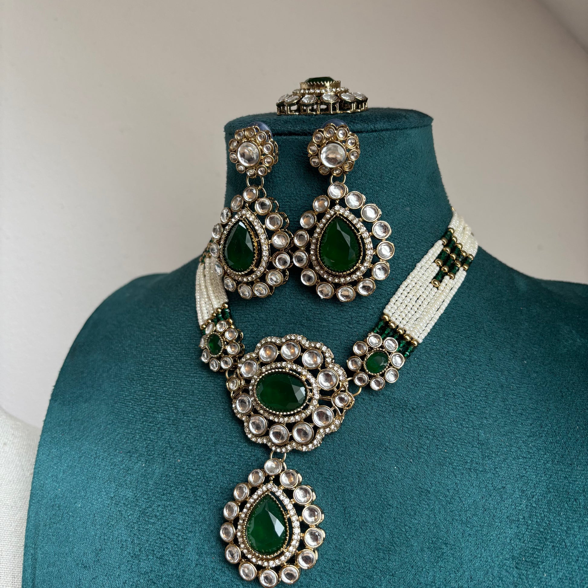 Elegant faux kundan green stone choker/necklace with matching statement earrings and tikka