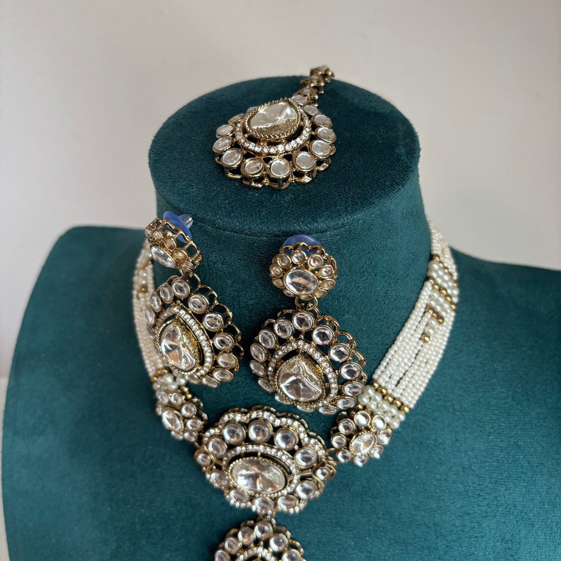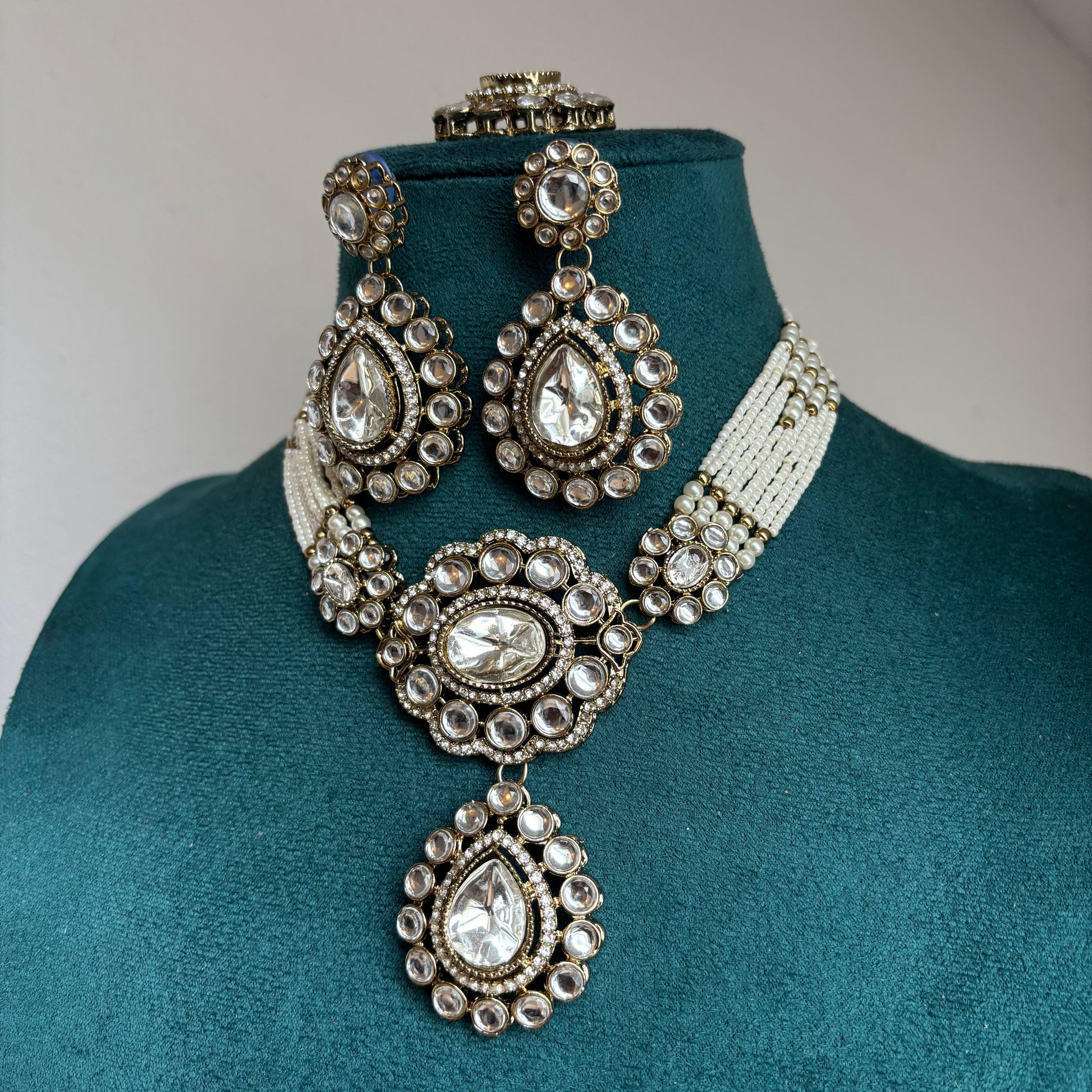 Elegant faux kundan white stone choker/necklace with matching statement earrings and tikka
