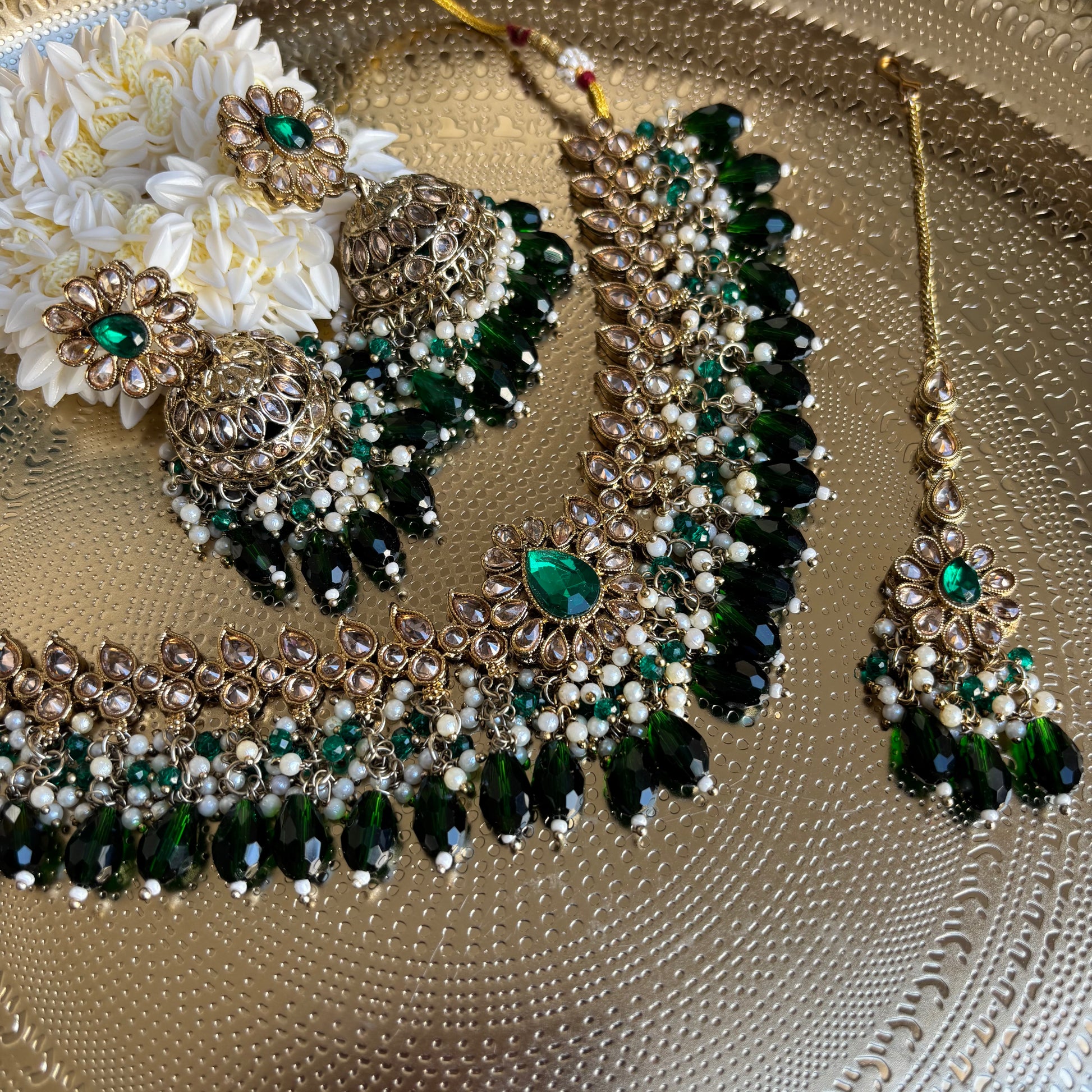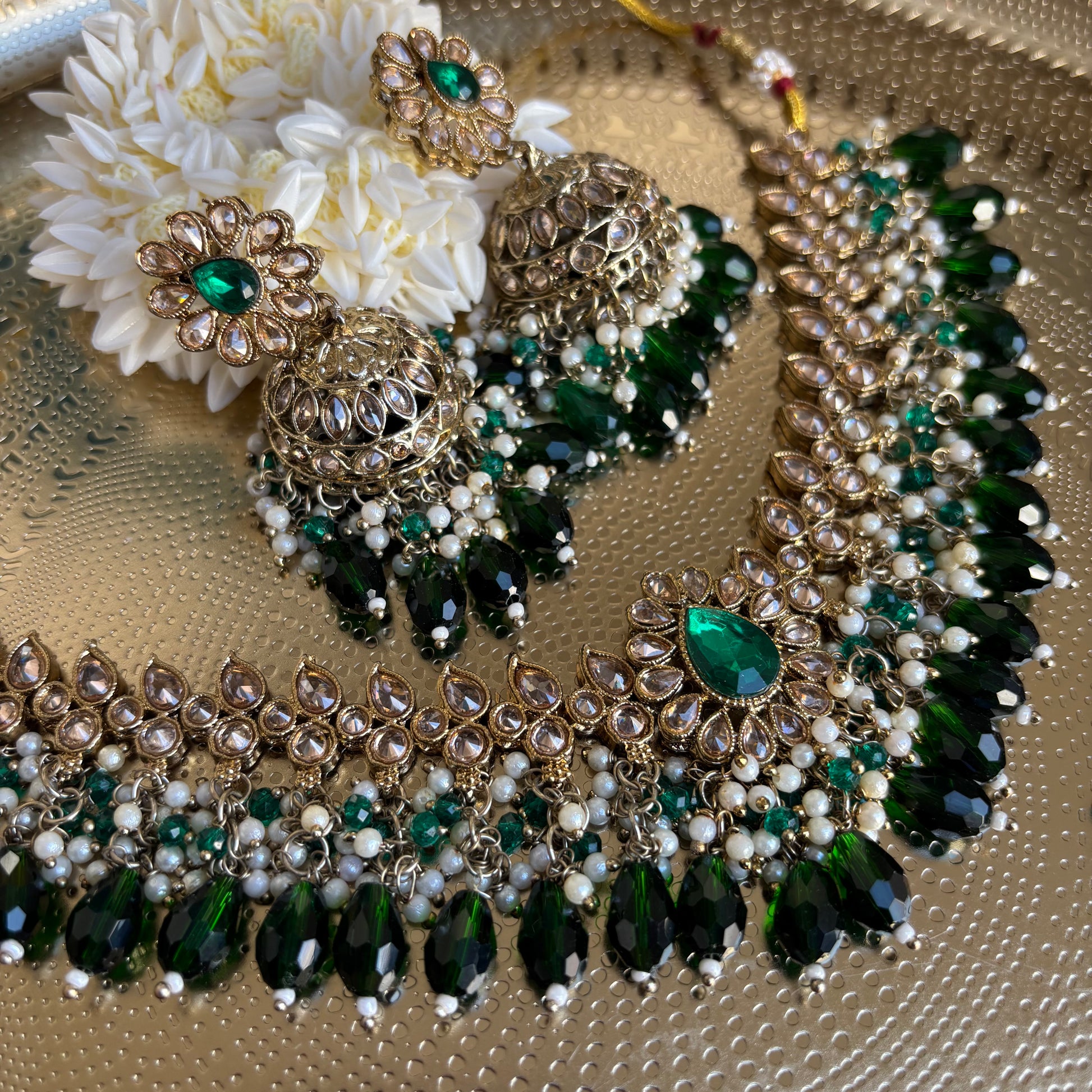 Exclusive green statement 2 in 1 necklace with matching statement jhumkas and tikka