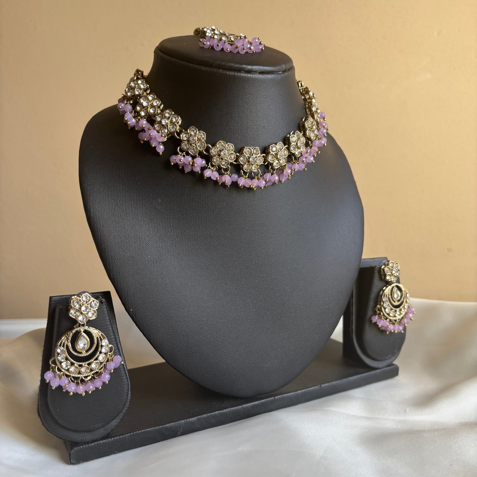Beautiful antique gold necklace with dropping lavender beada comes with matching tikka and earrings