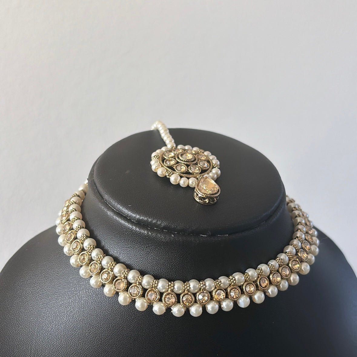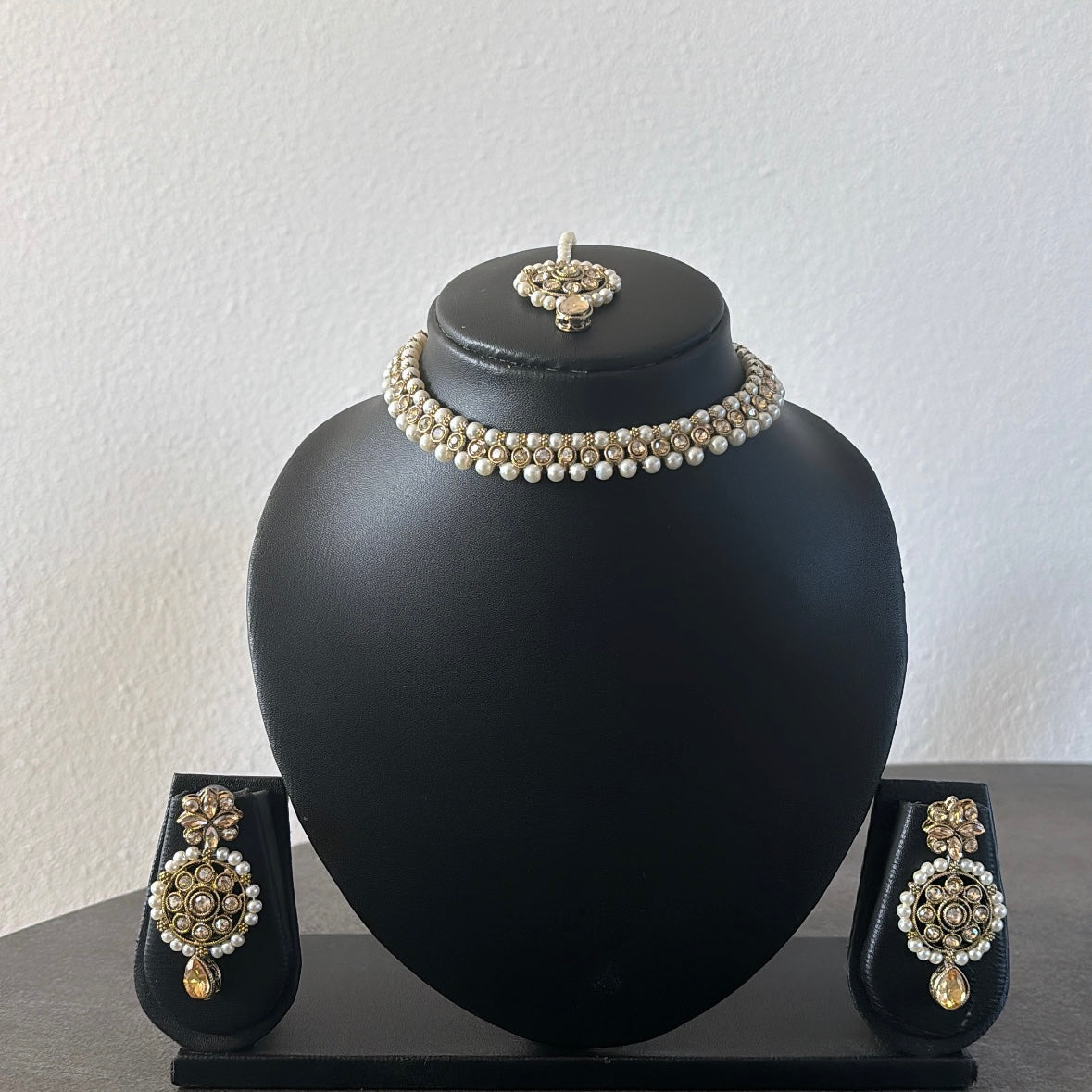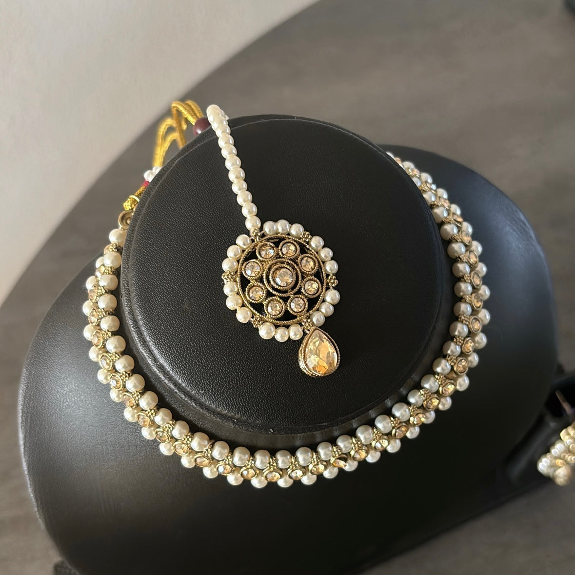 Antique gold pearl choker with matching earrings and tikka. Perfect for those who want to wear something minimalistic.