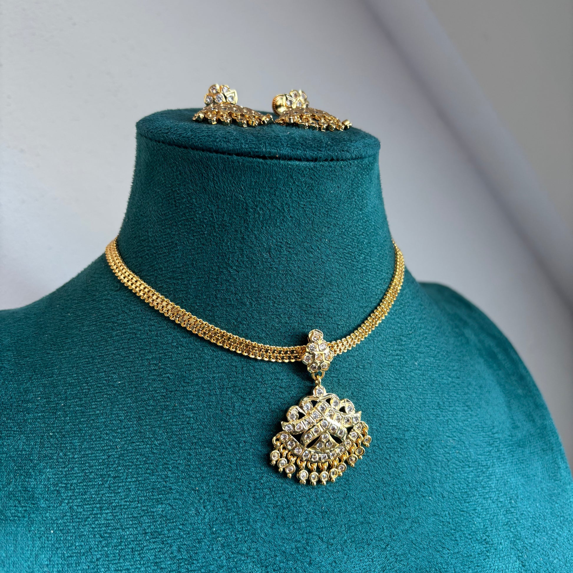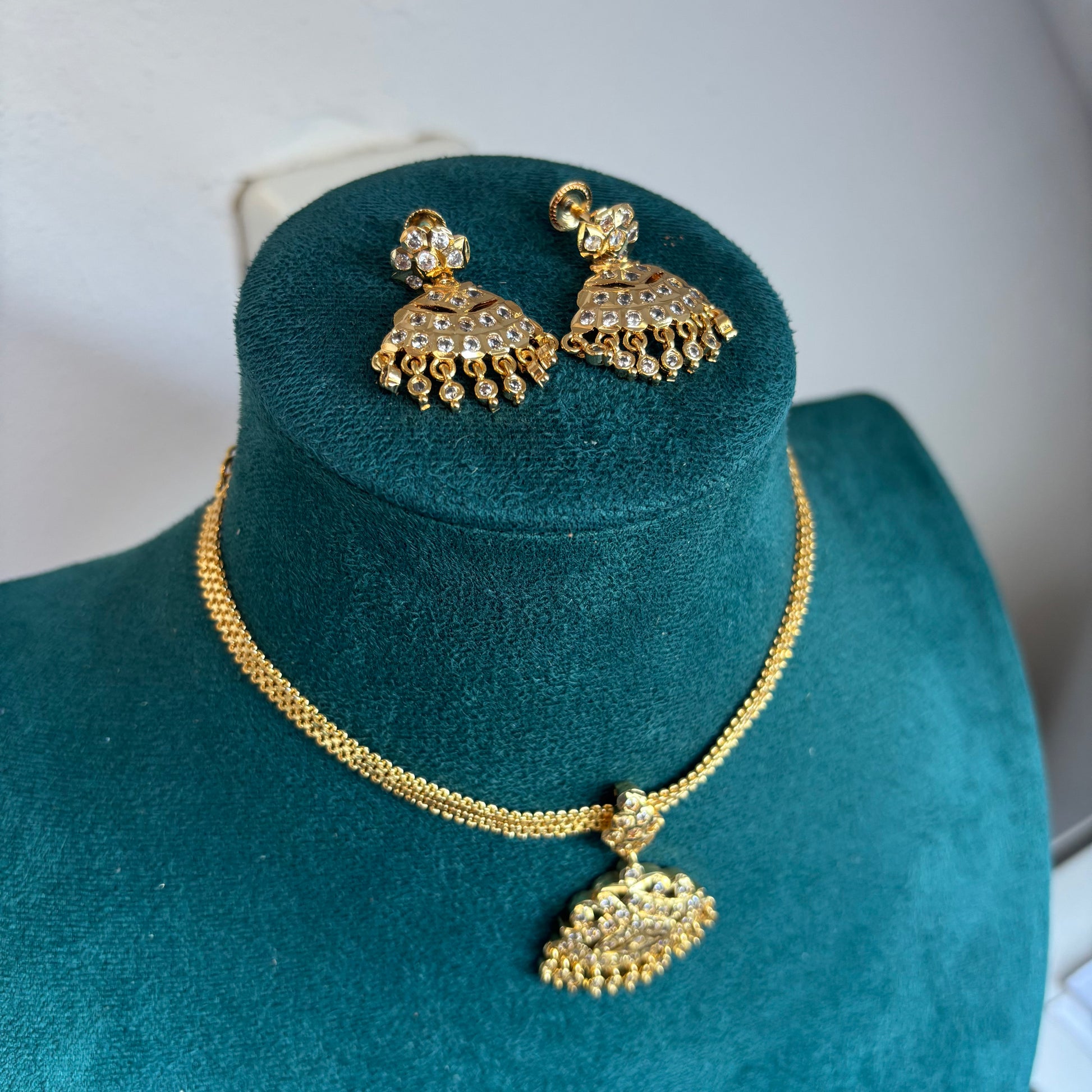 Trending gold plated white stone short necklace with matching white stone earrings (screw back)