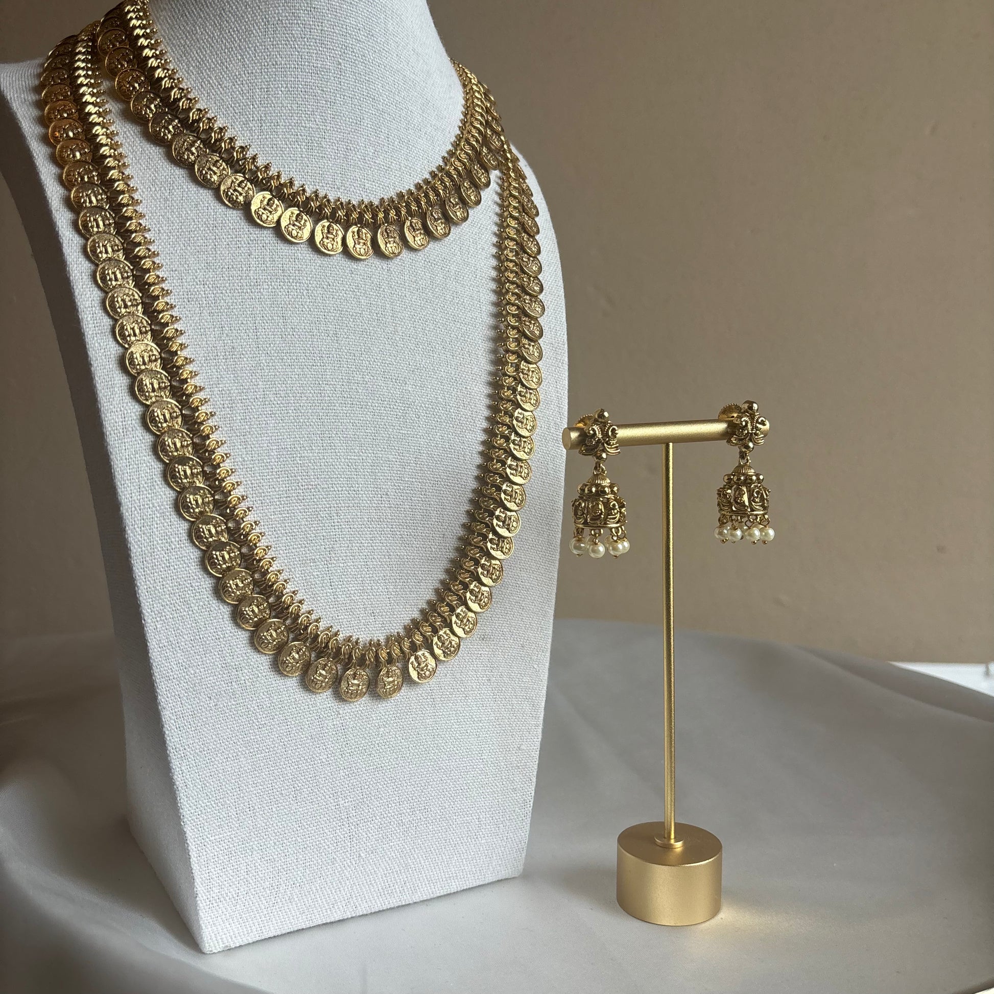 Exclusive matte gold Lakshmi combo necklaces with matching jhumkas