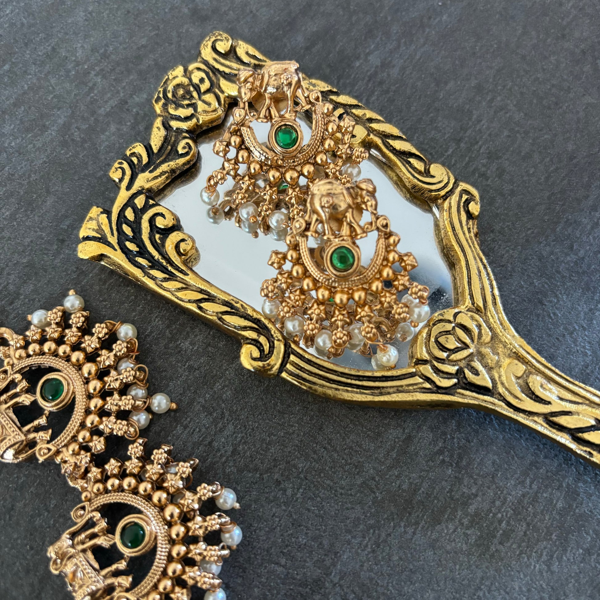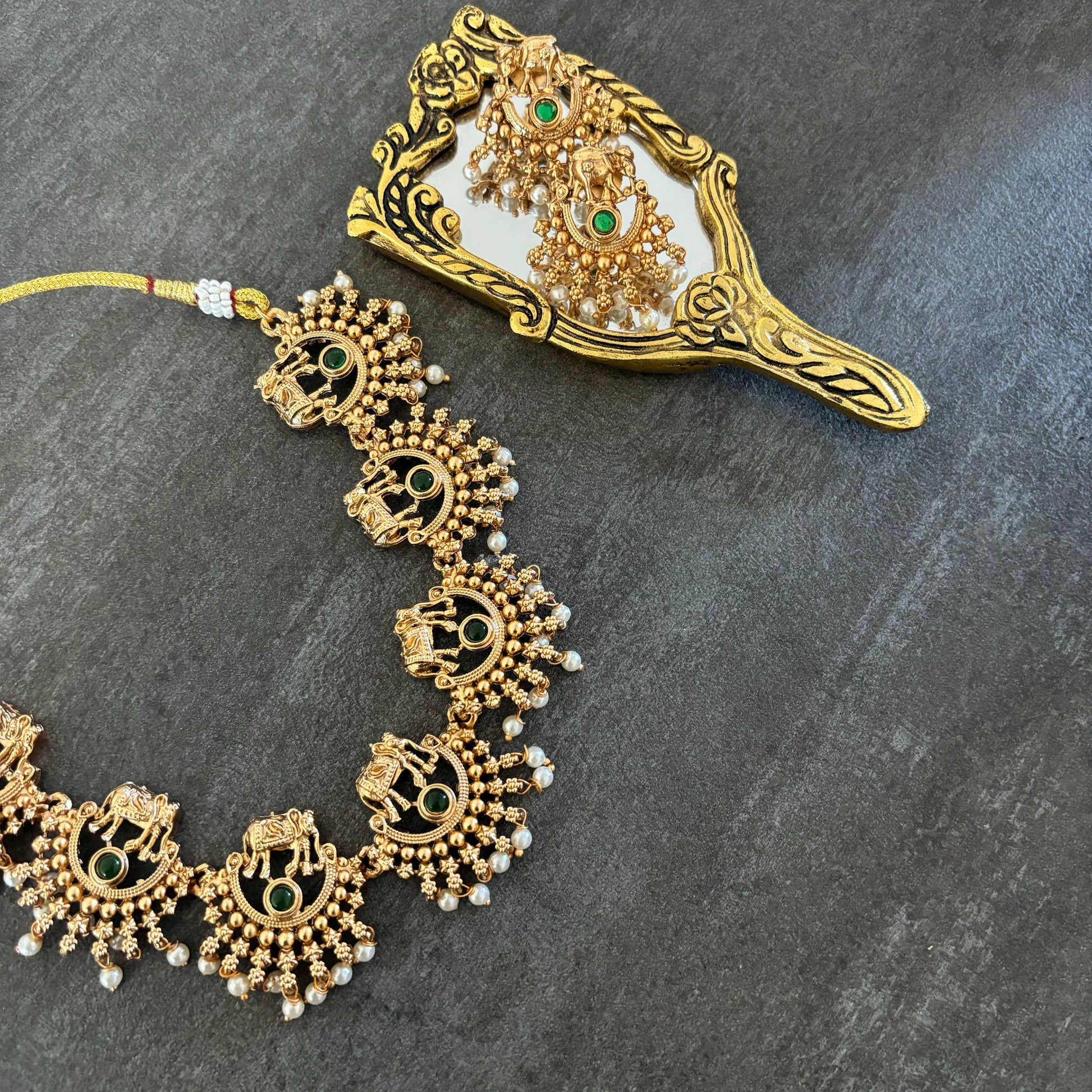 Matte gold green stone elephant motif short necklace with matching cute elephant studs