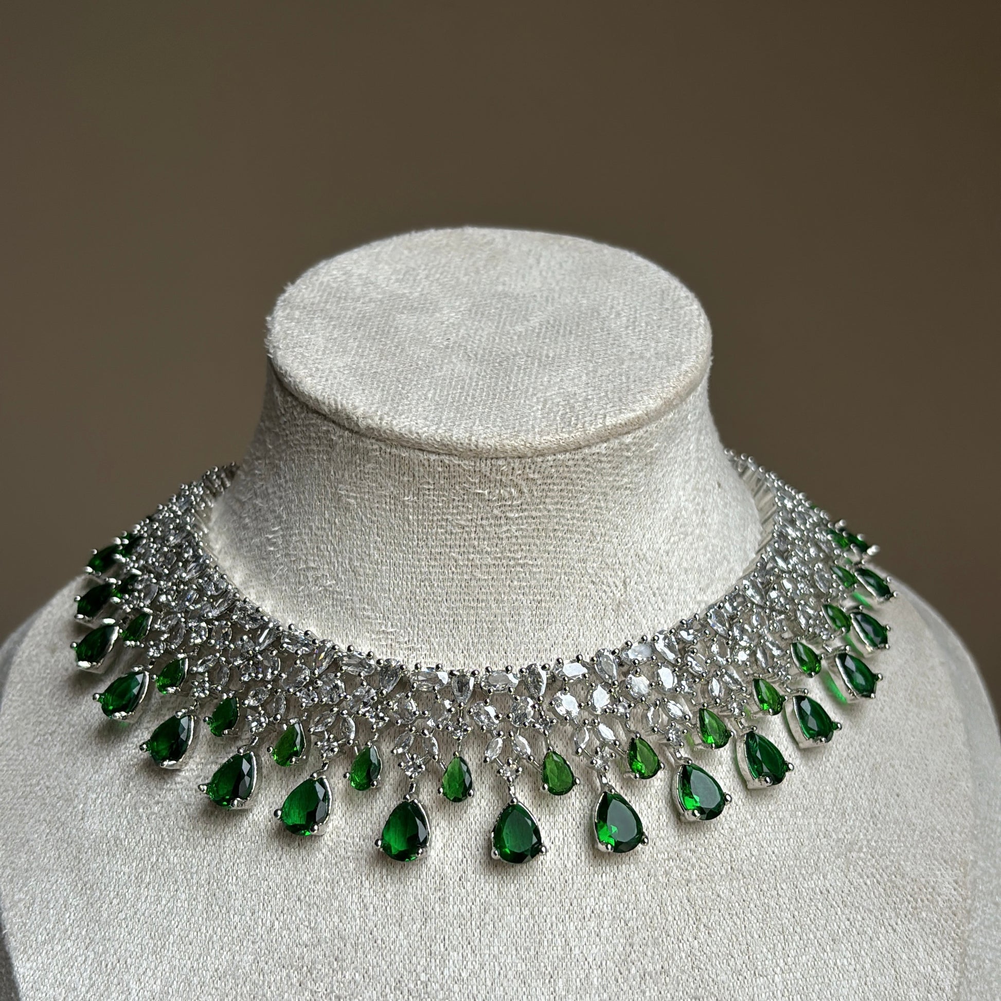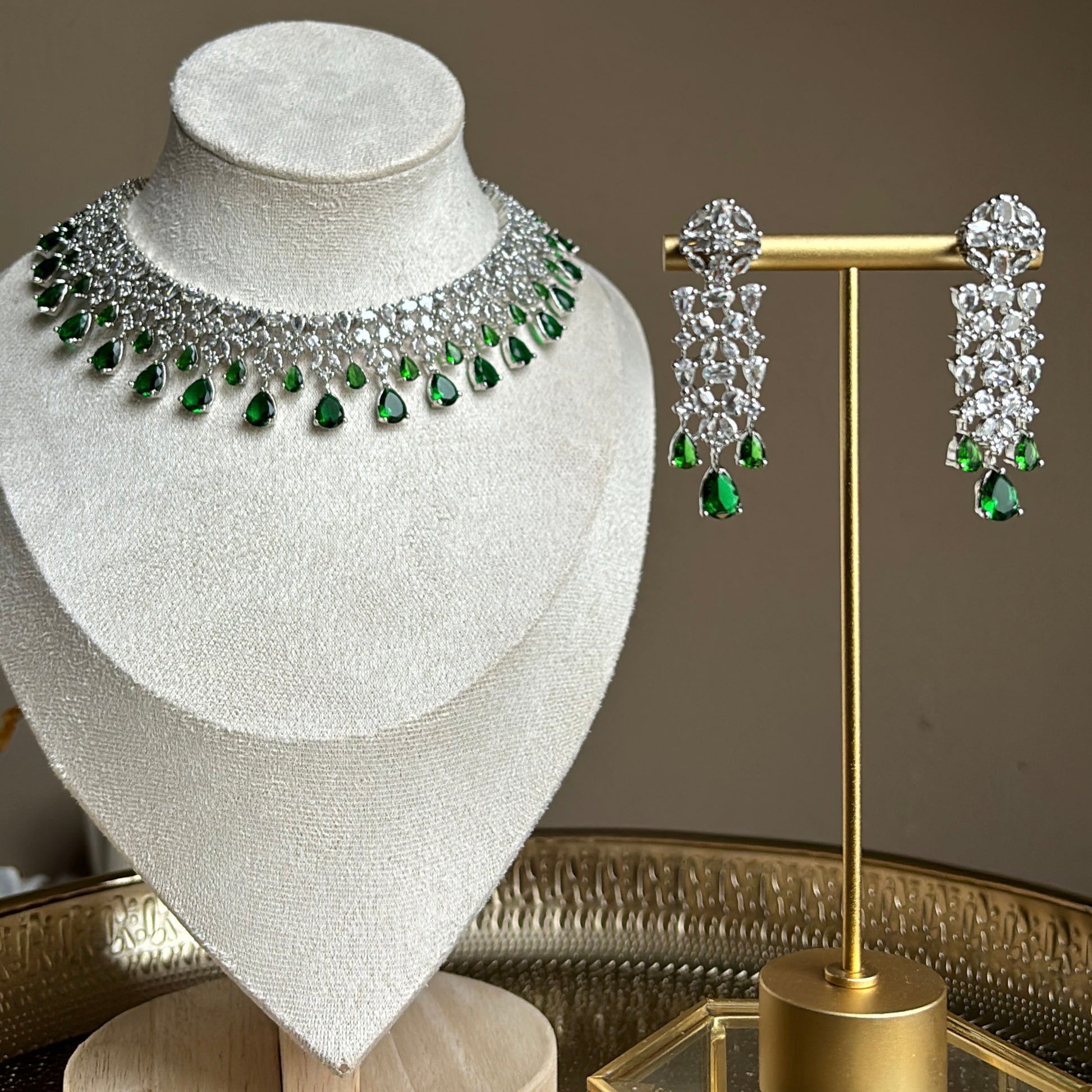Exclusive emerald green / silver luxury short necklace with matching earrings