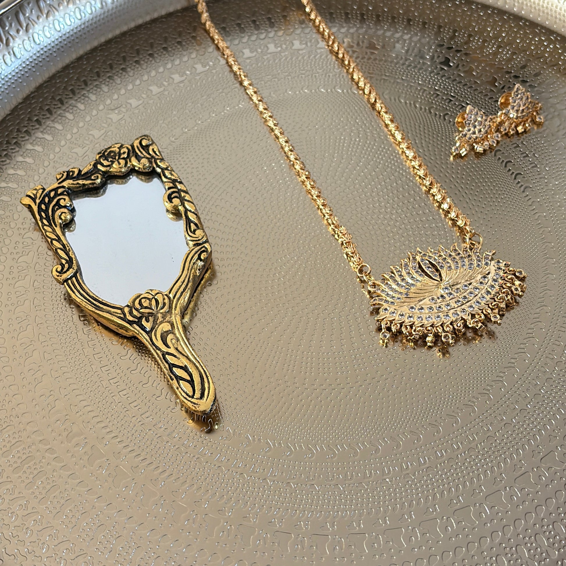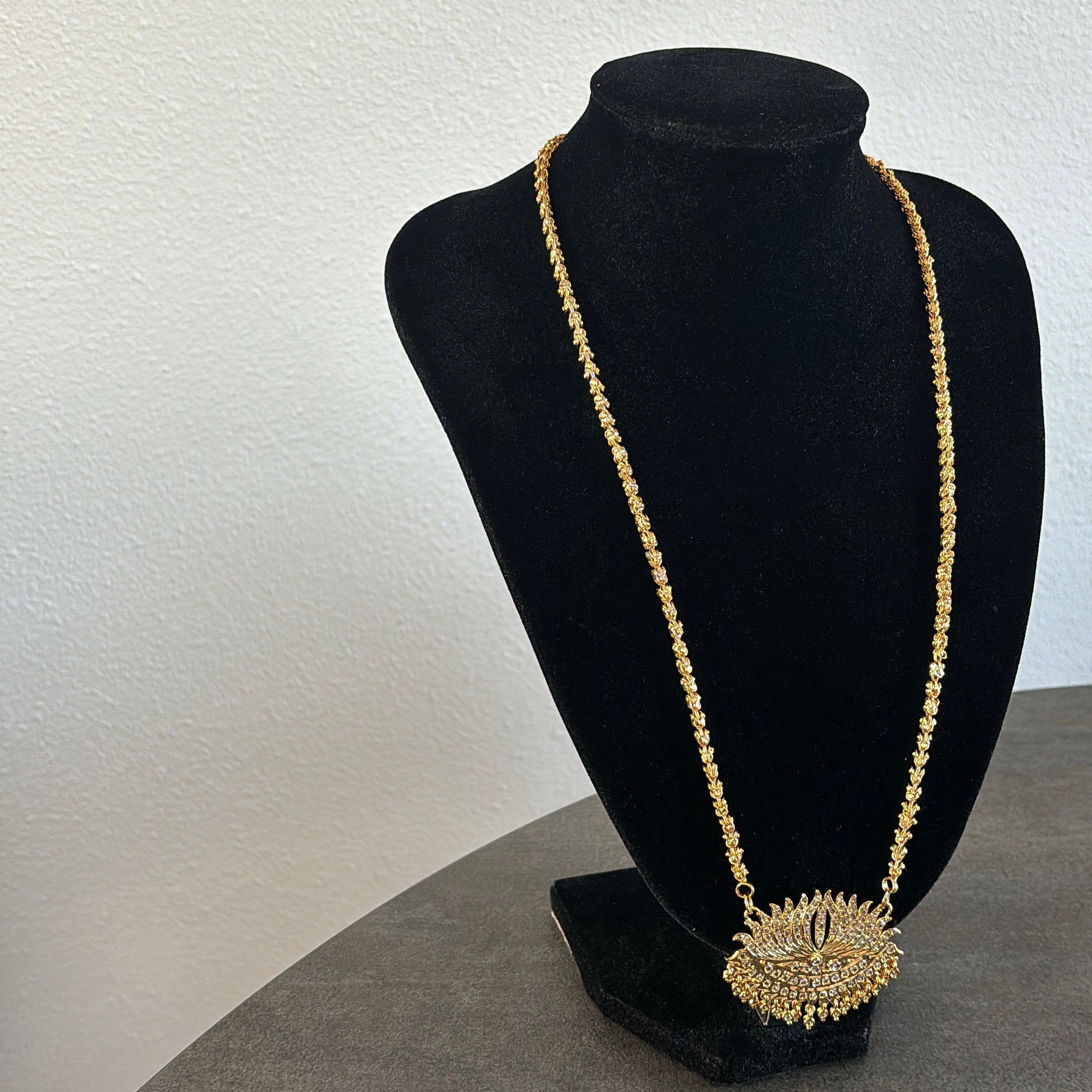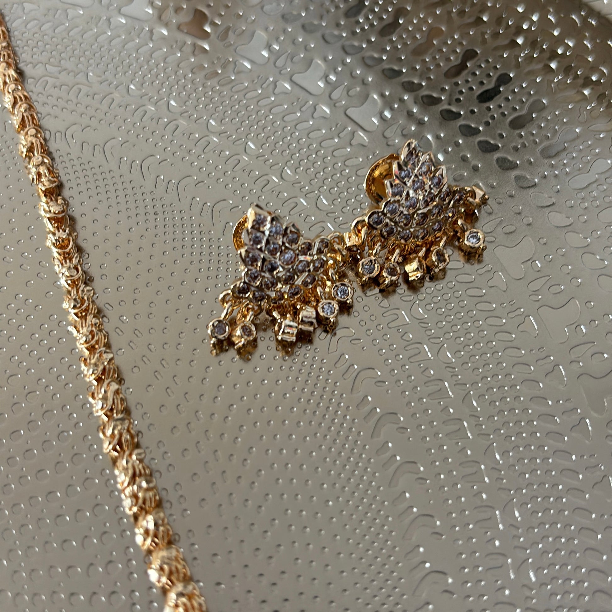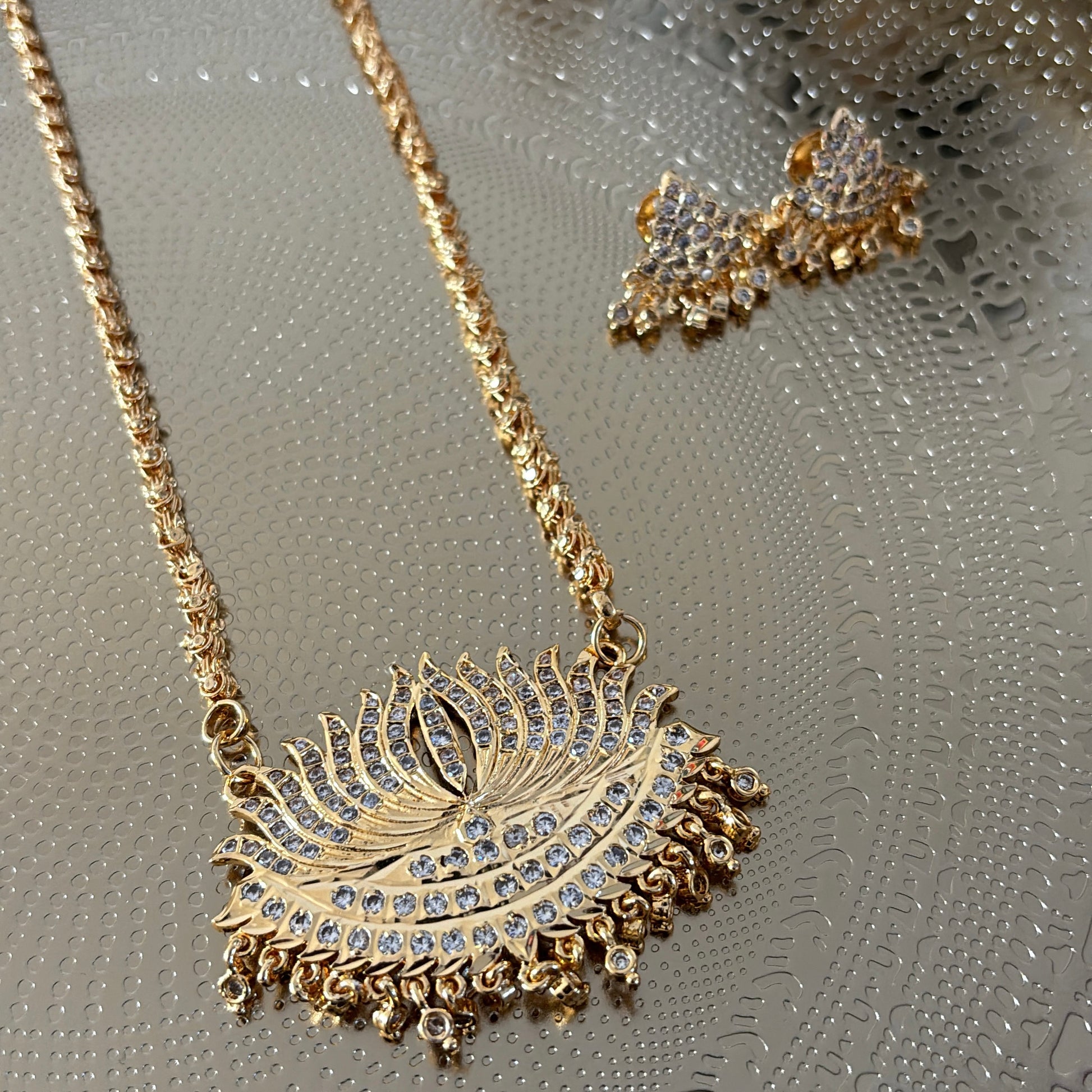 Our bestselling gold plated white stone lotus pathakkam with gold chain comes with matching white stone earrings (screw back)