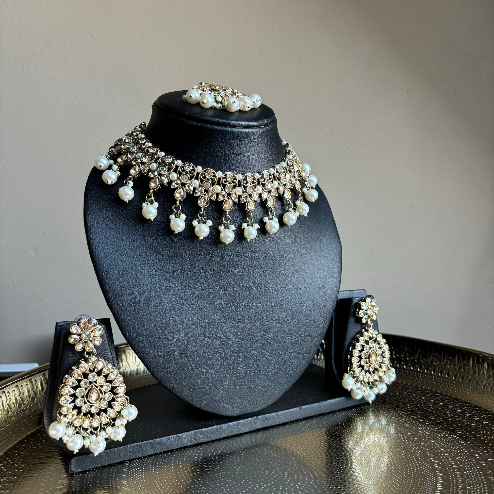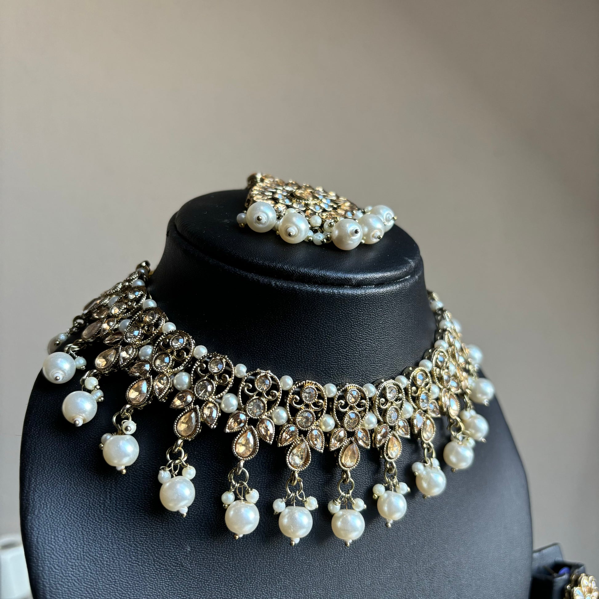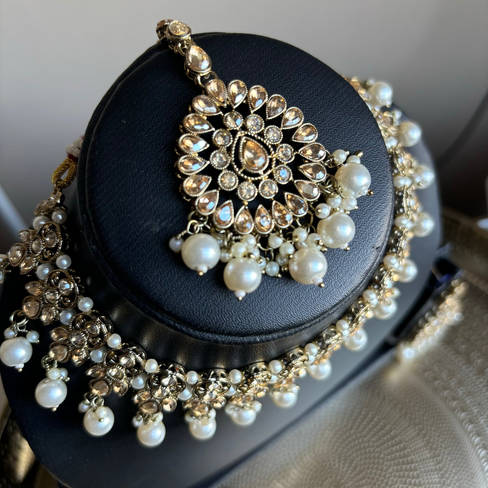 Antique gold choker/short necklace with matching statement earrings and tikka