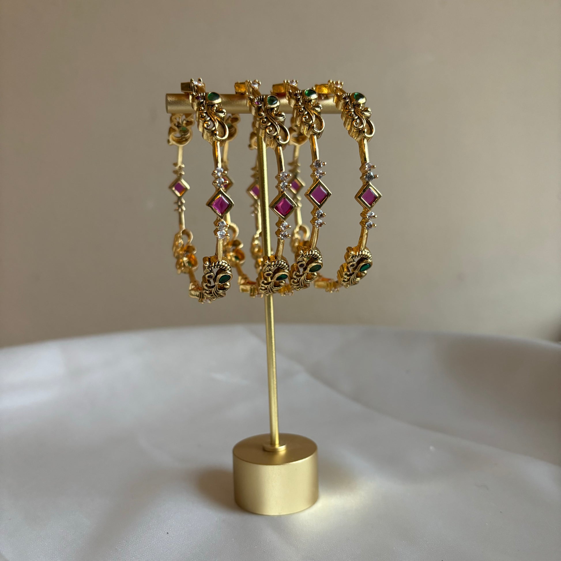 Exclusive multi colour statement bangles with peacock details. The perfect accessories to finish your traditional look.