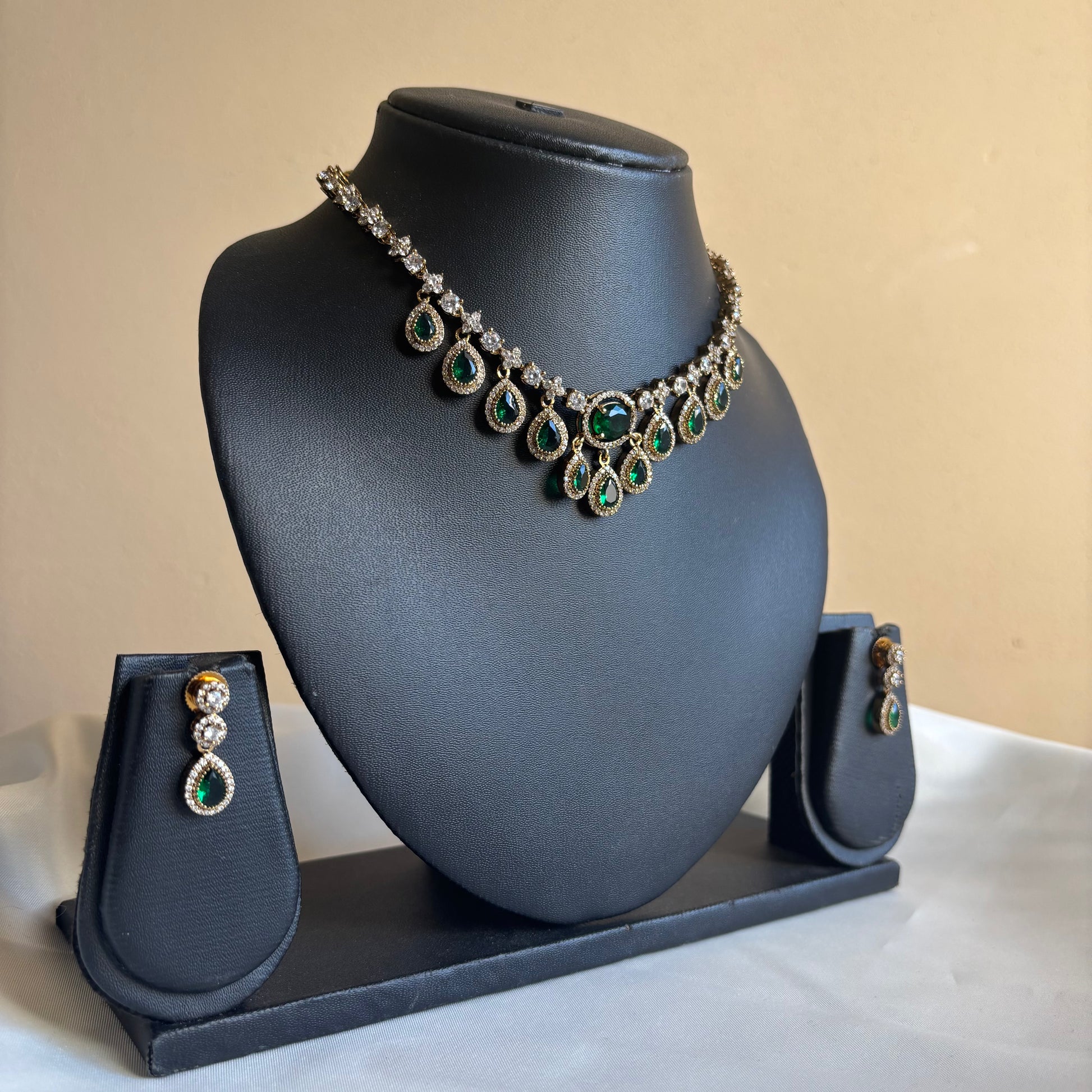 Exclusive green white CZ stone short necklace with matching elegant earrings