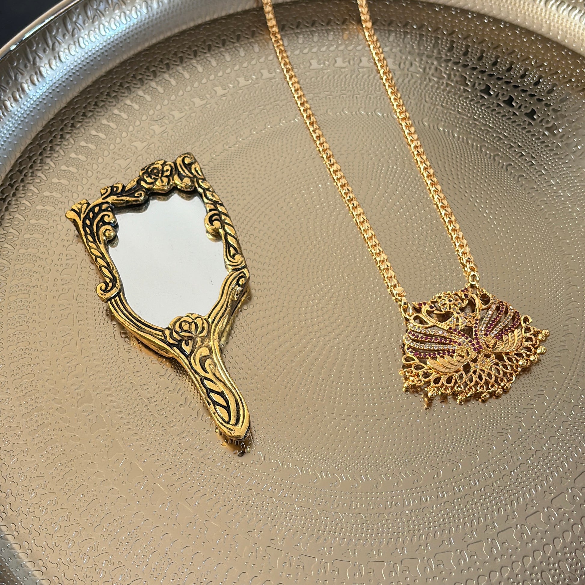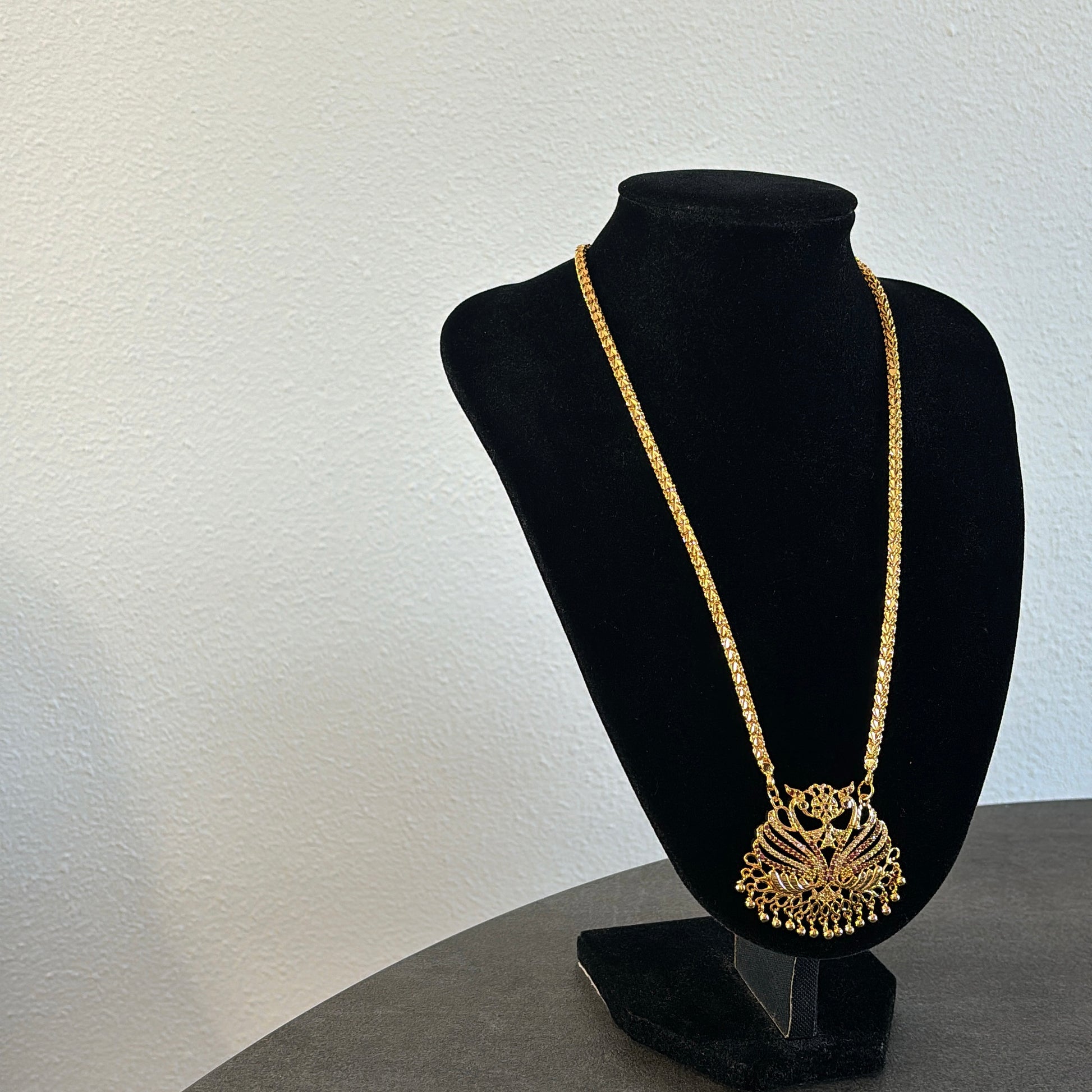 Our bestselling ruby white stone gold plated pathakkam chain with gold pearl drops