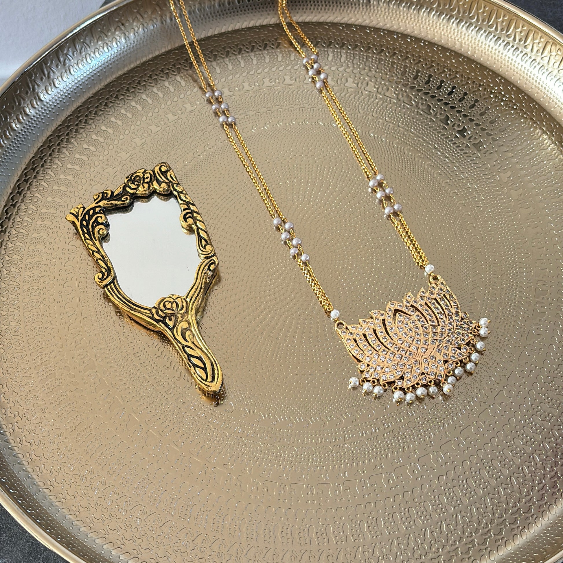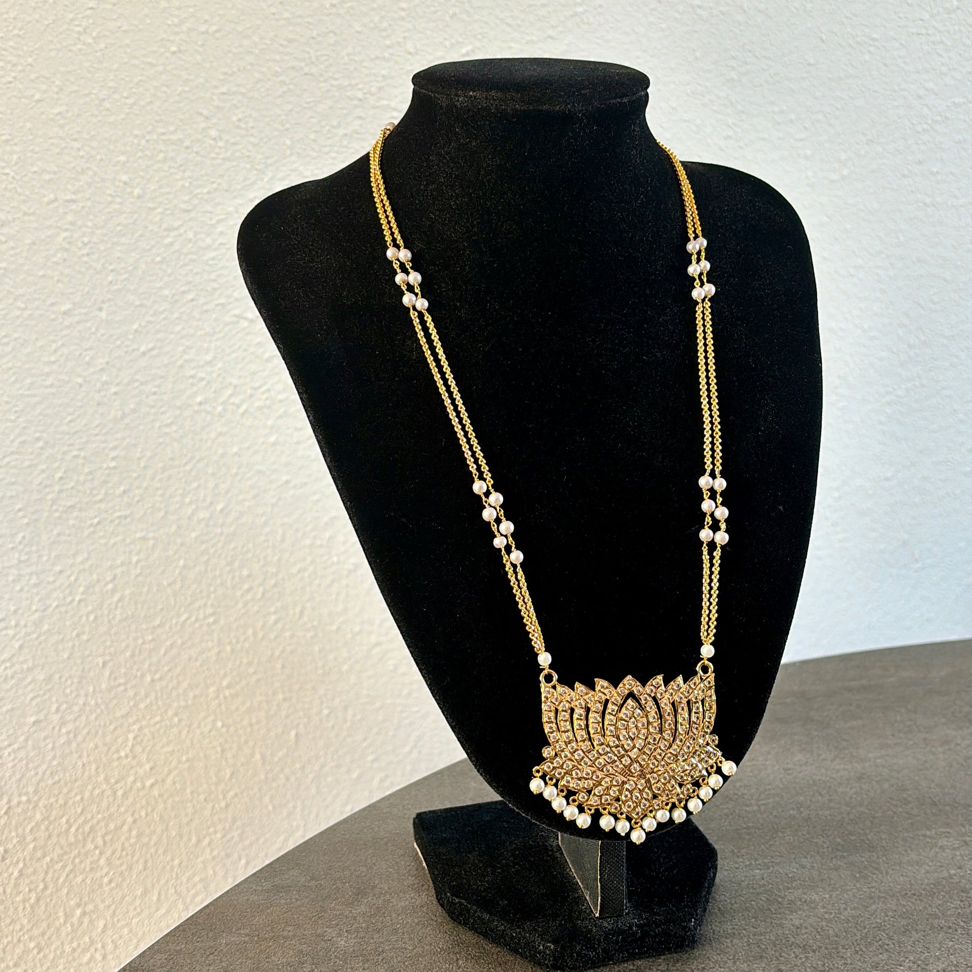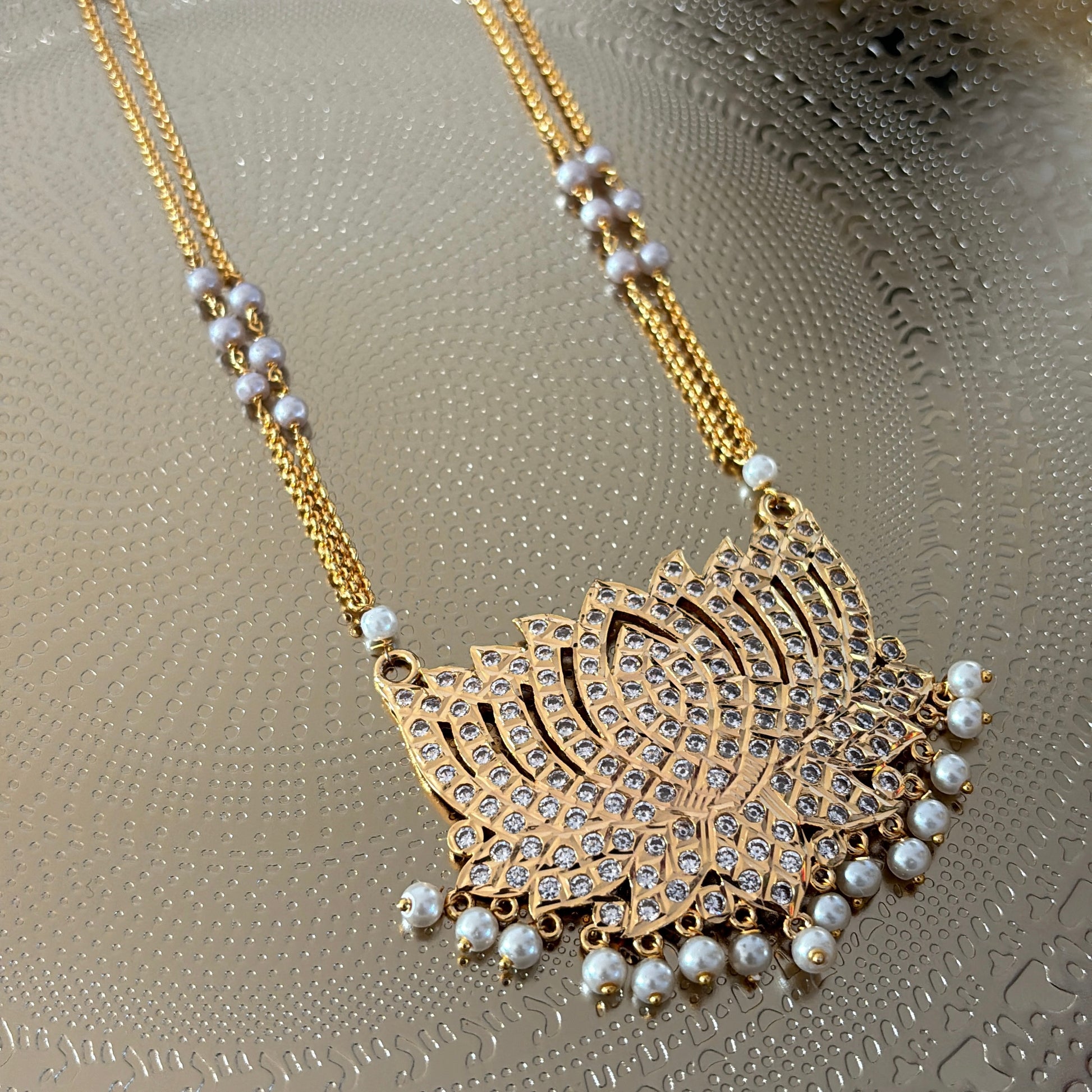 Our bestselling gold plated white stone lotus pathakkam chain with dropping pearl work