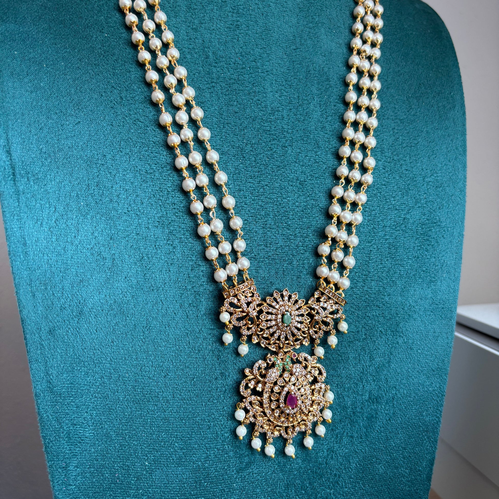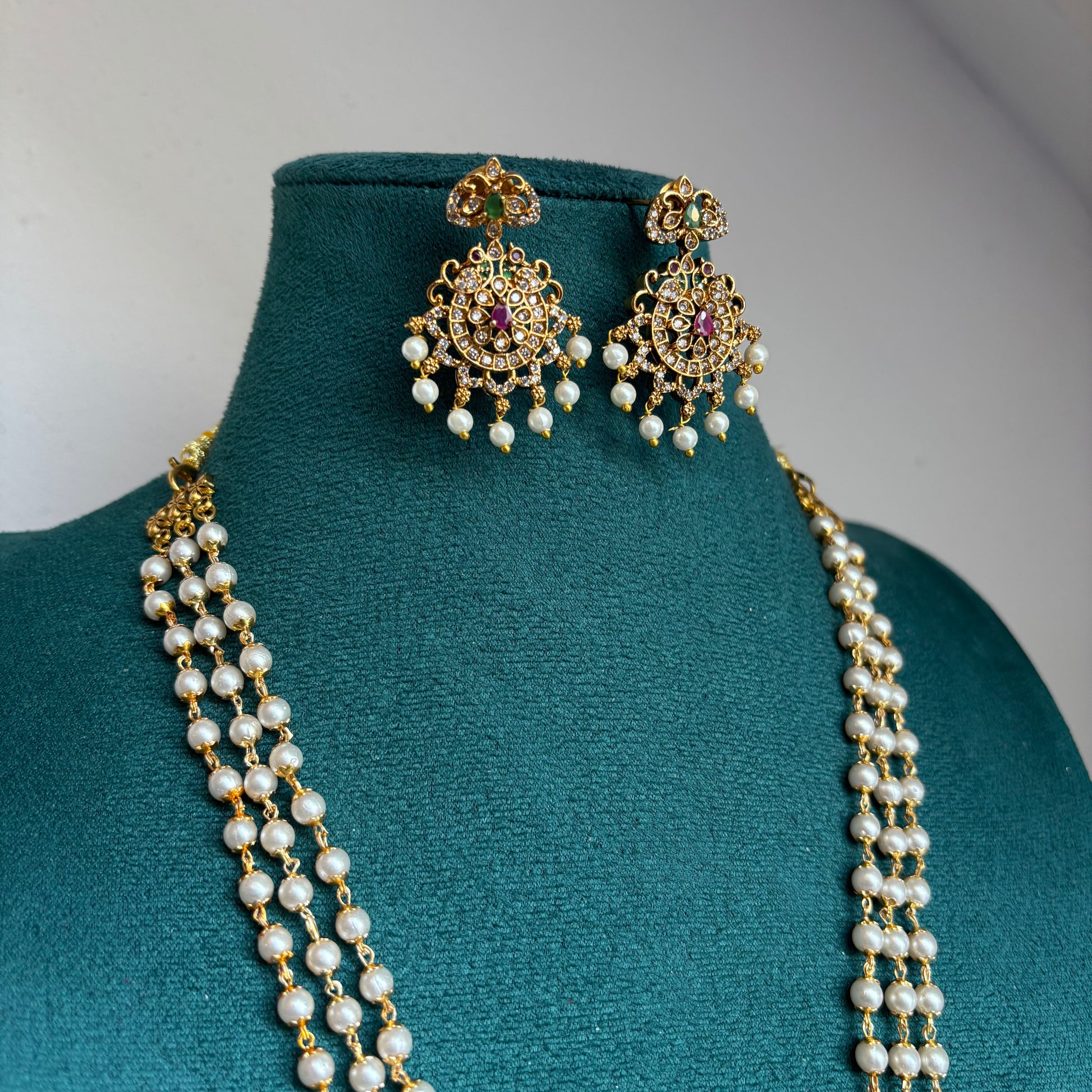Premium multi colour stone long necklace with pearl details comes with matching earrings