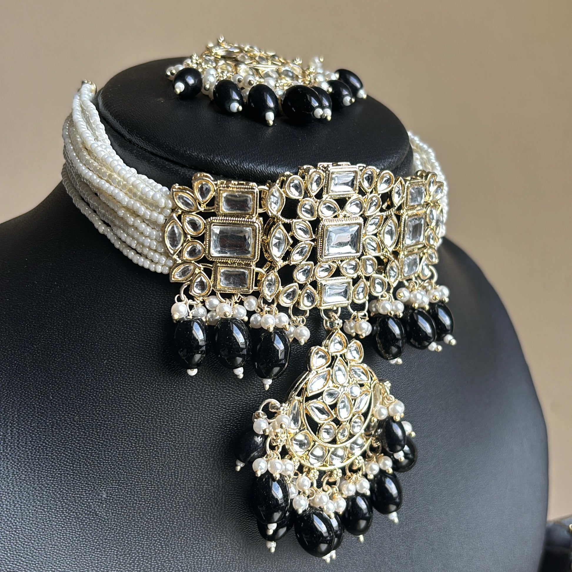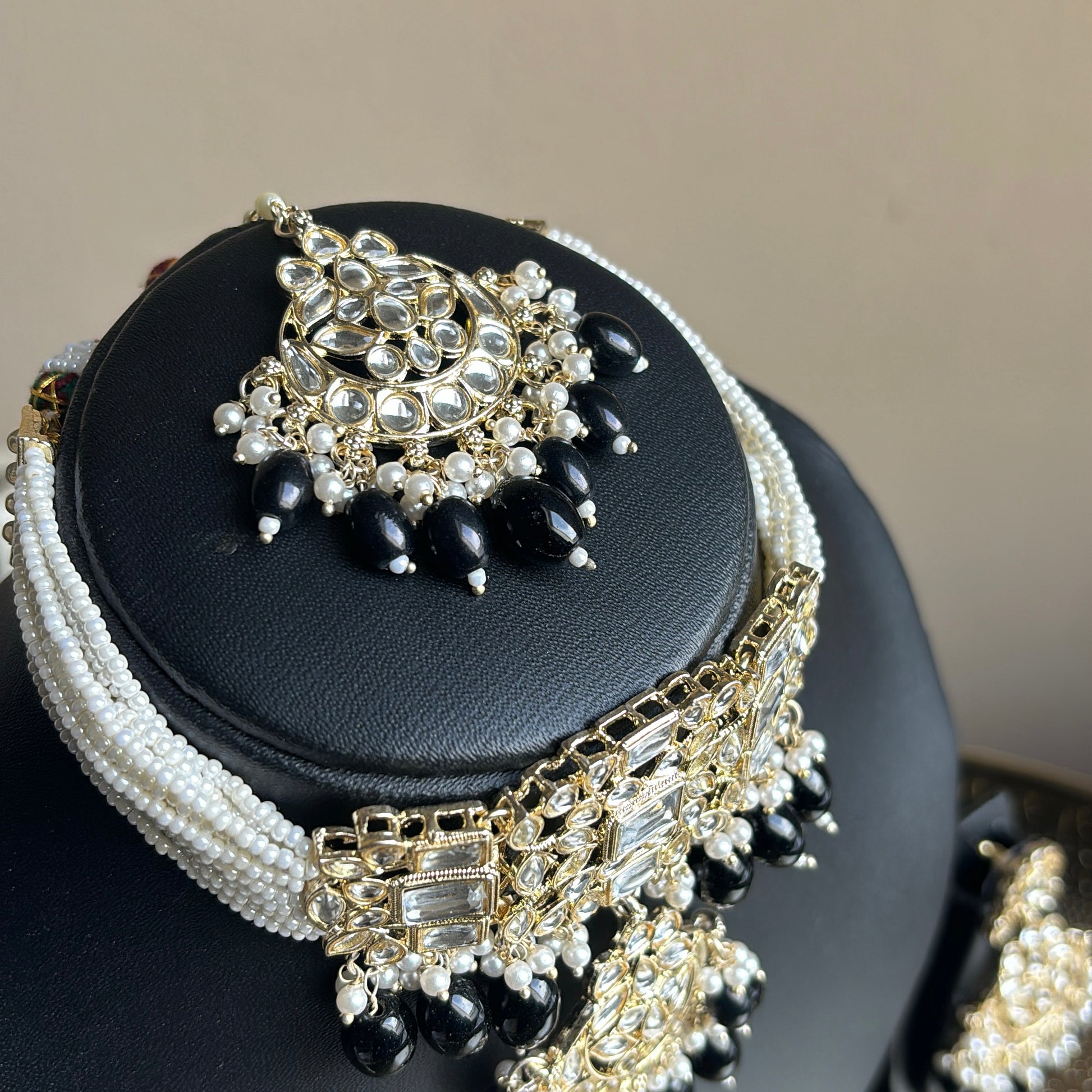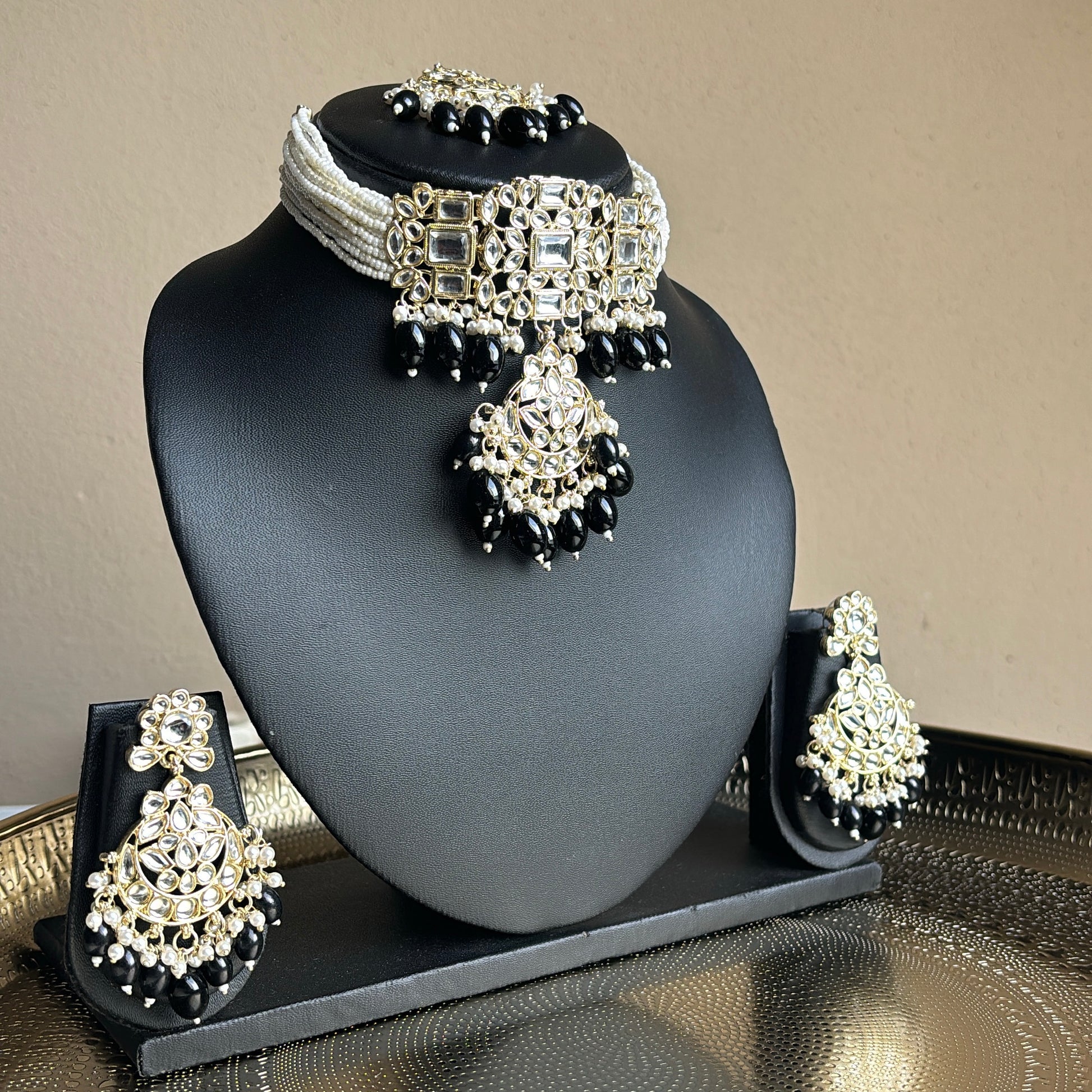 Exclusive black bead statement kundan choker with matching statement earrings and tikka