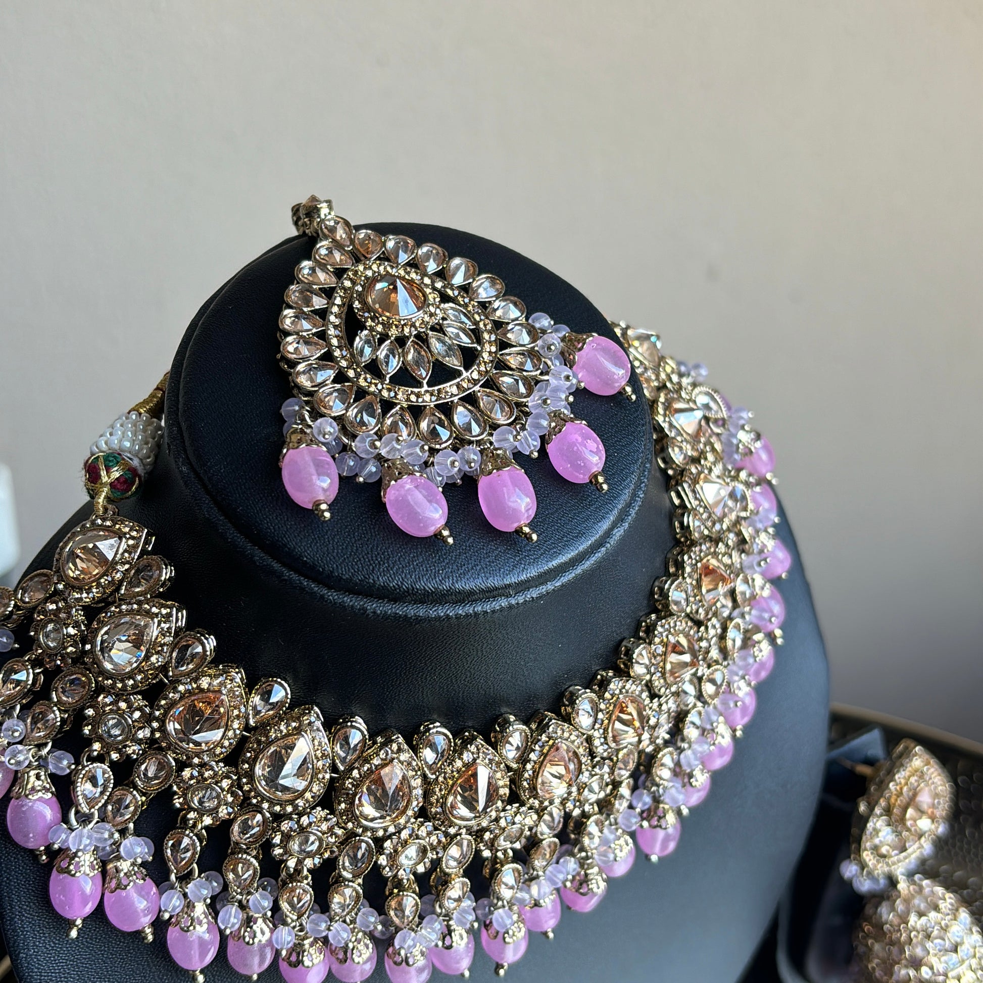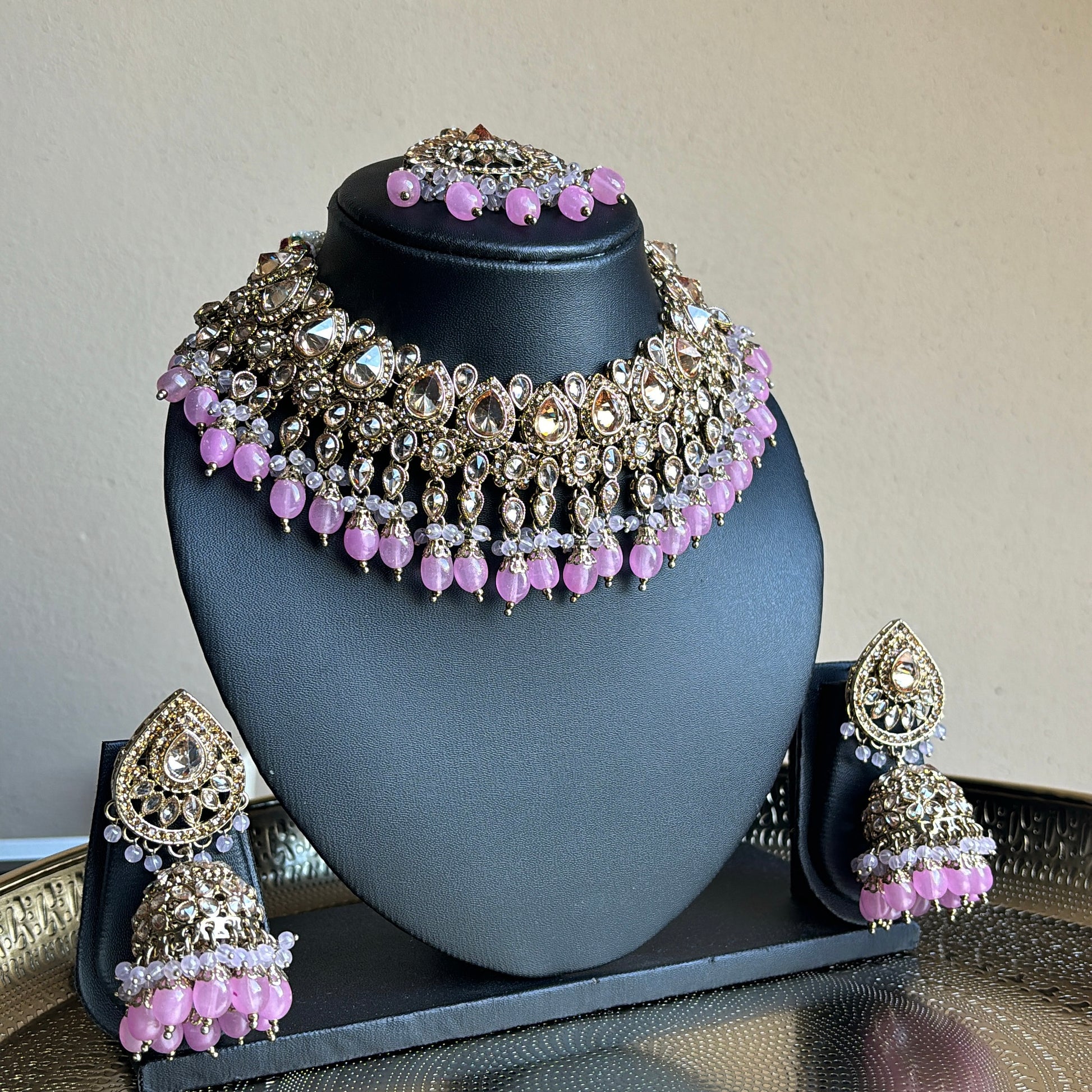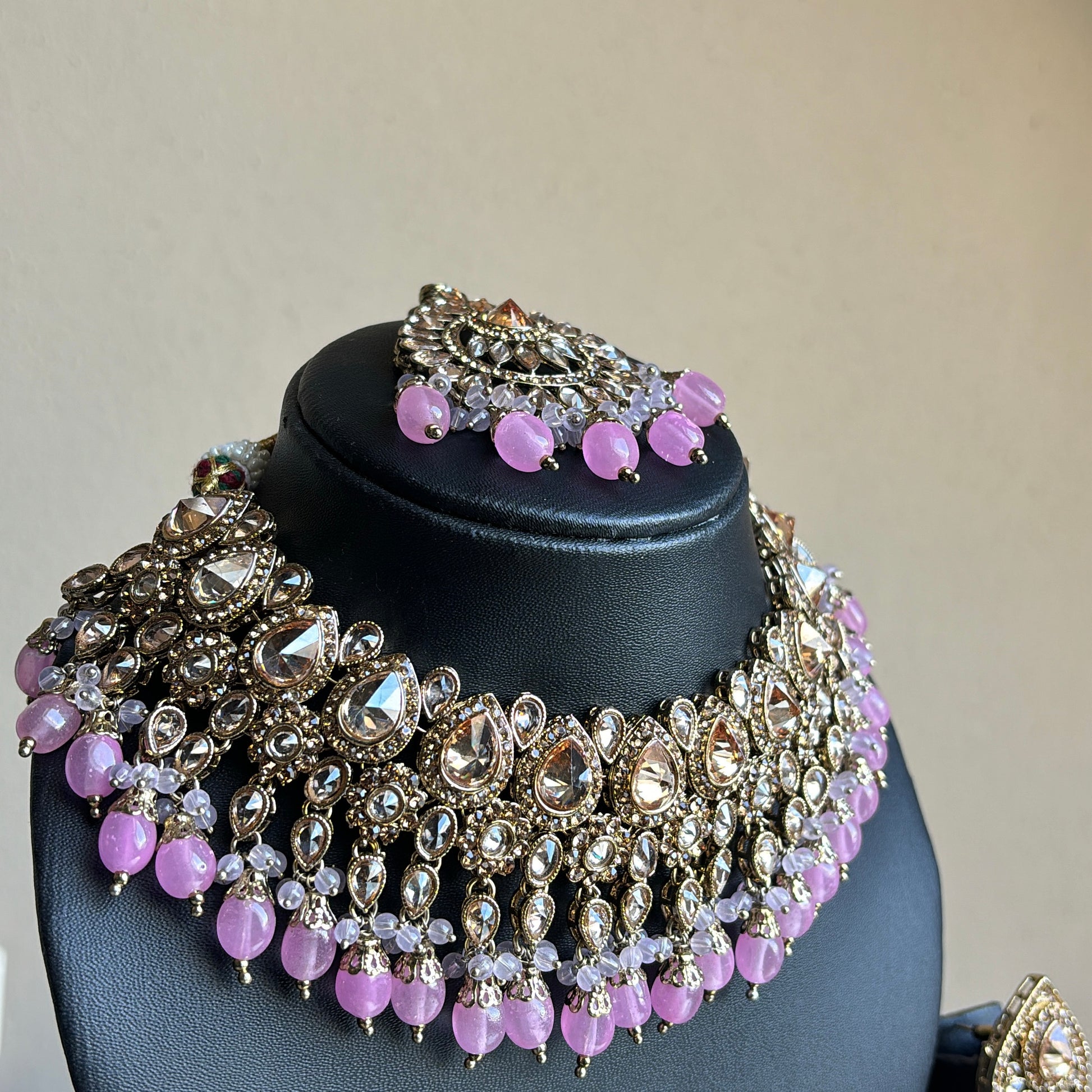 Our bestselling lavender bead short statement necklace/choker with matching statement jhumkas and tikka