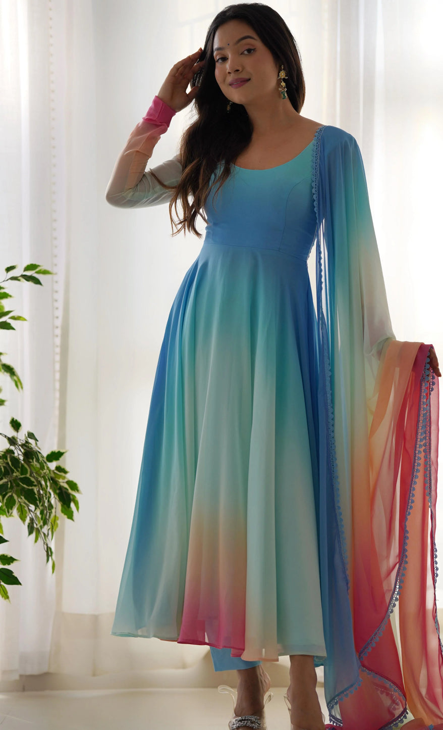 Trending multi colour fully stitched flair anarkali with matching pants and dupatta