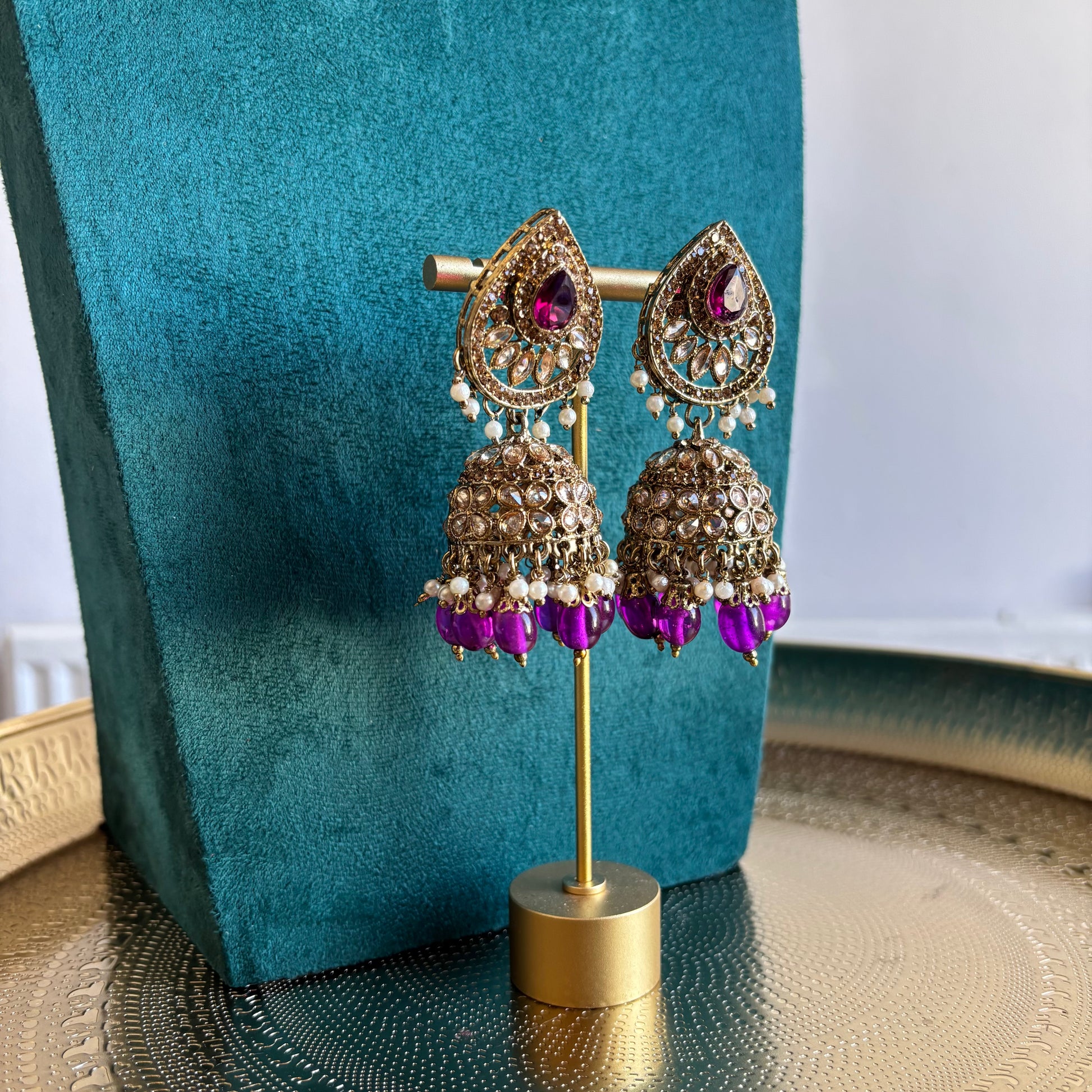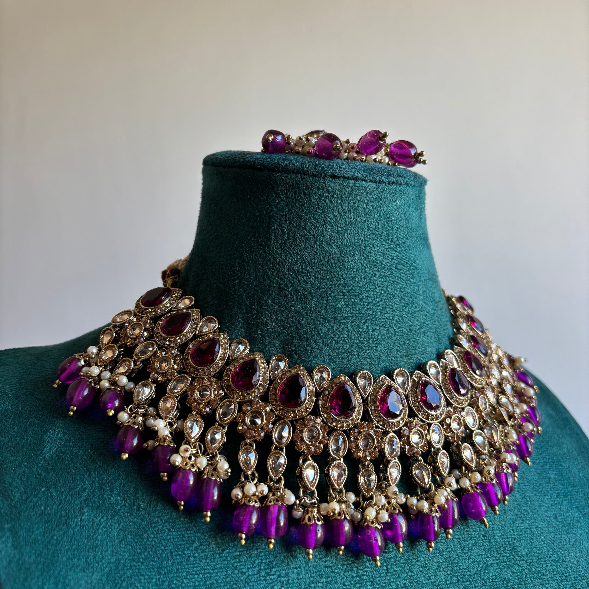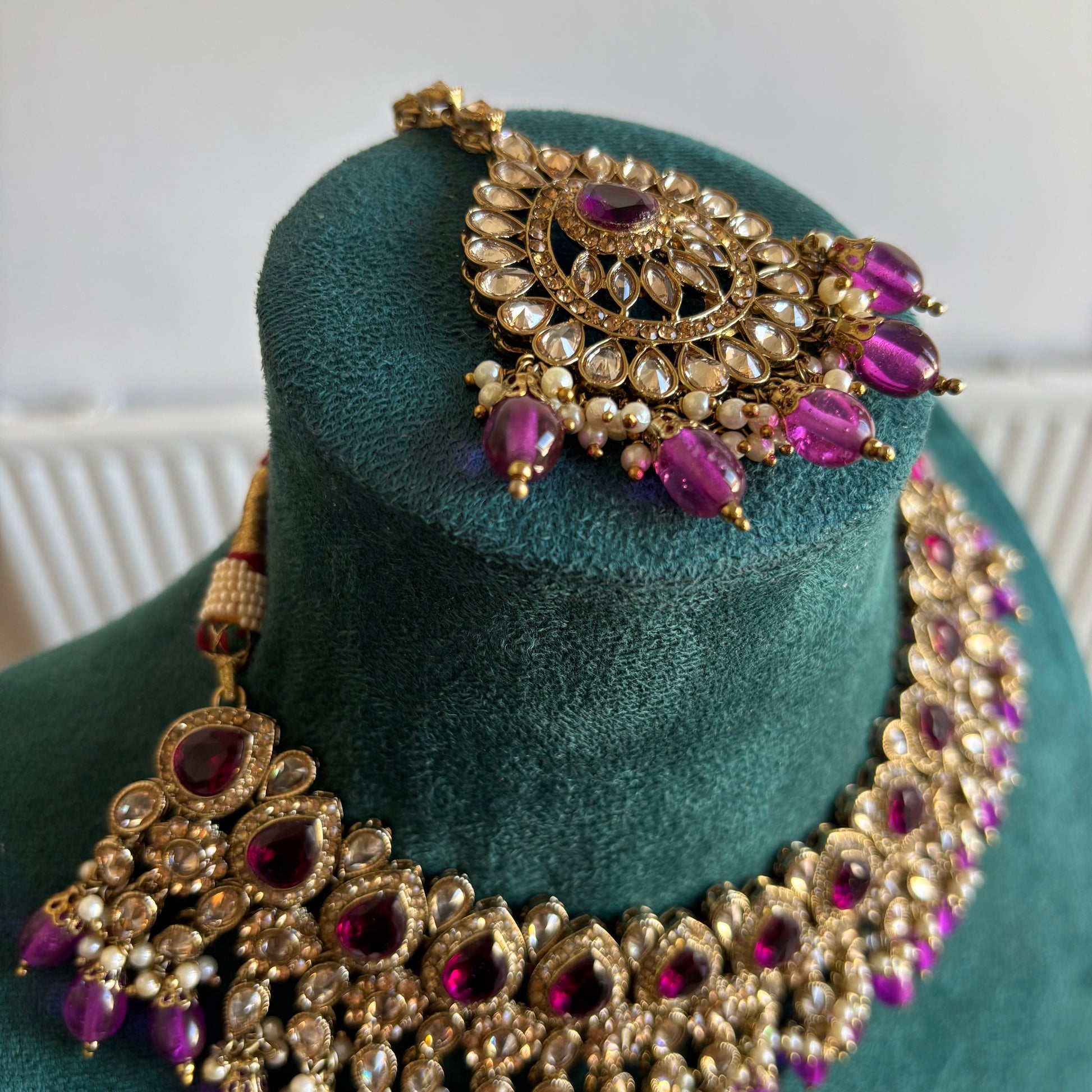 Purple stone/pearl necklace with matching jhumkas and tikka