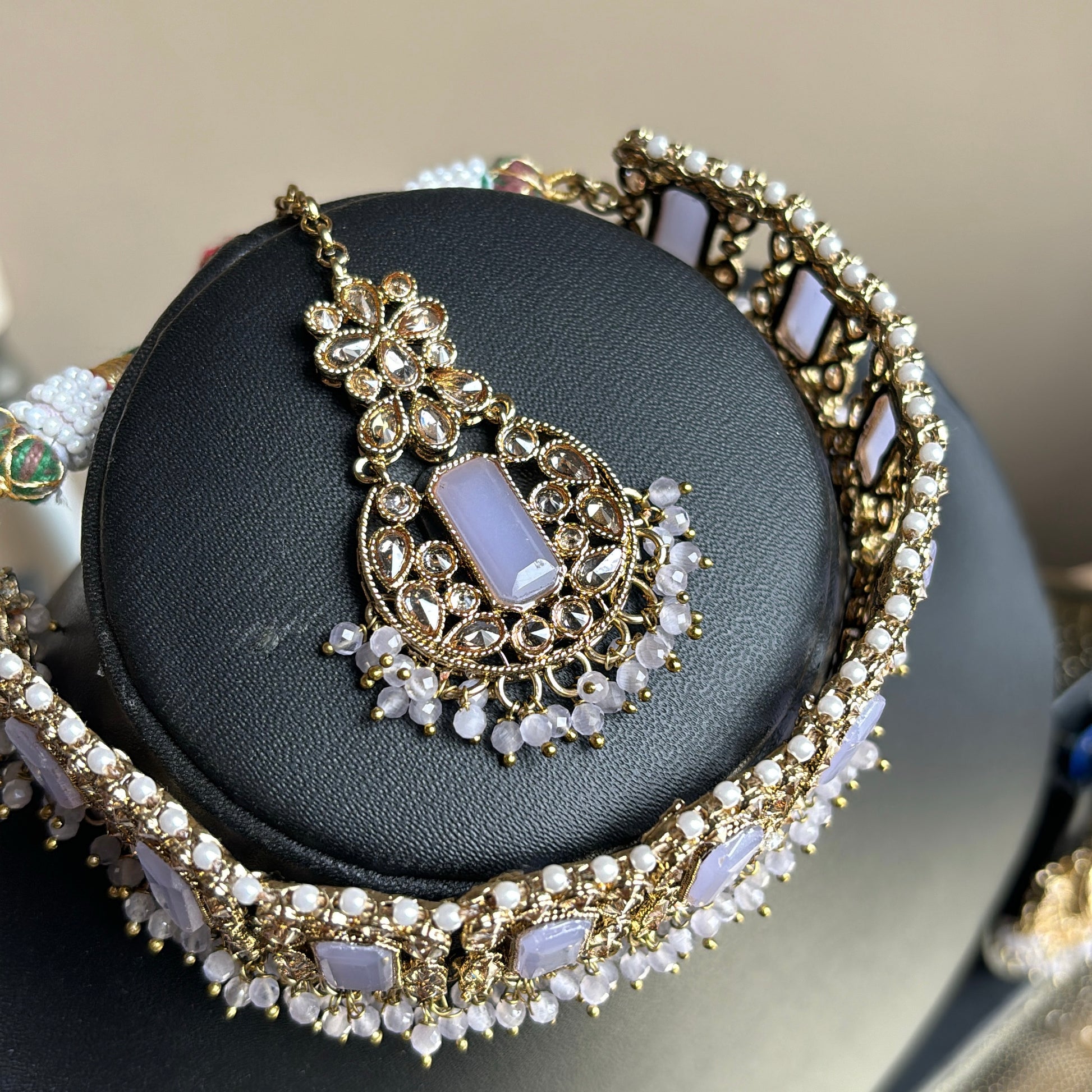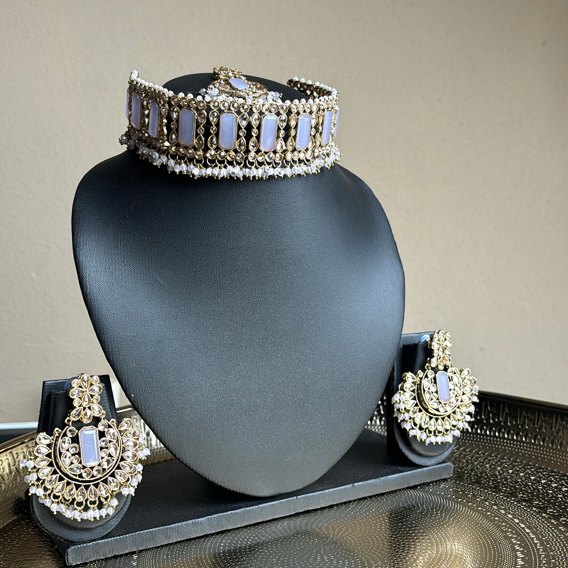 Bestselling greyish pink choker with matching statement earrings and tikka