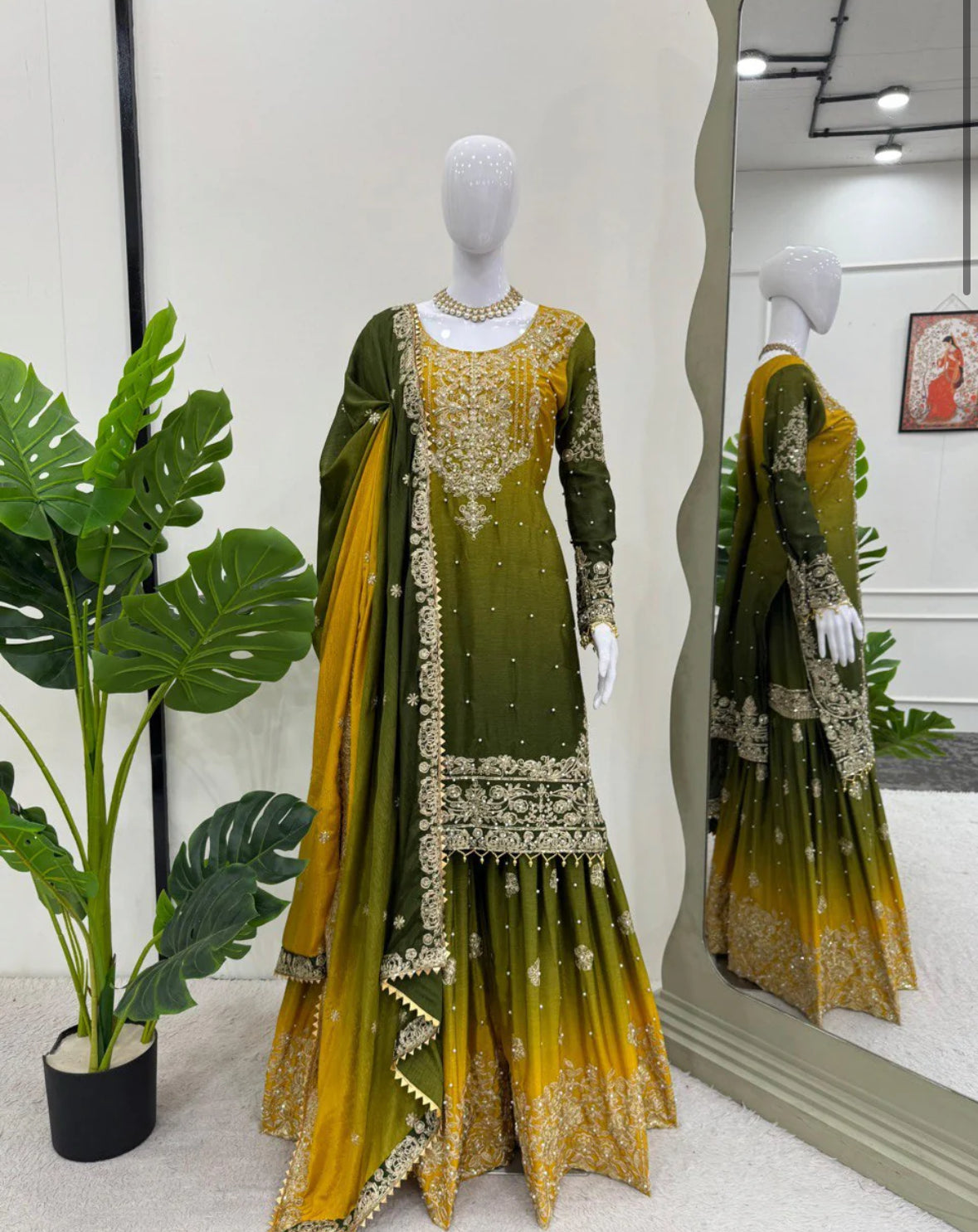 Exclusive ombre green fully stitched top with matching bottom and dupatta