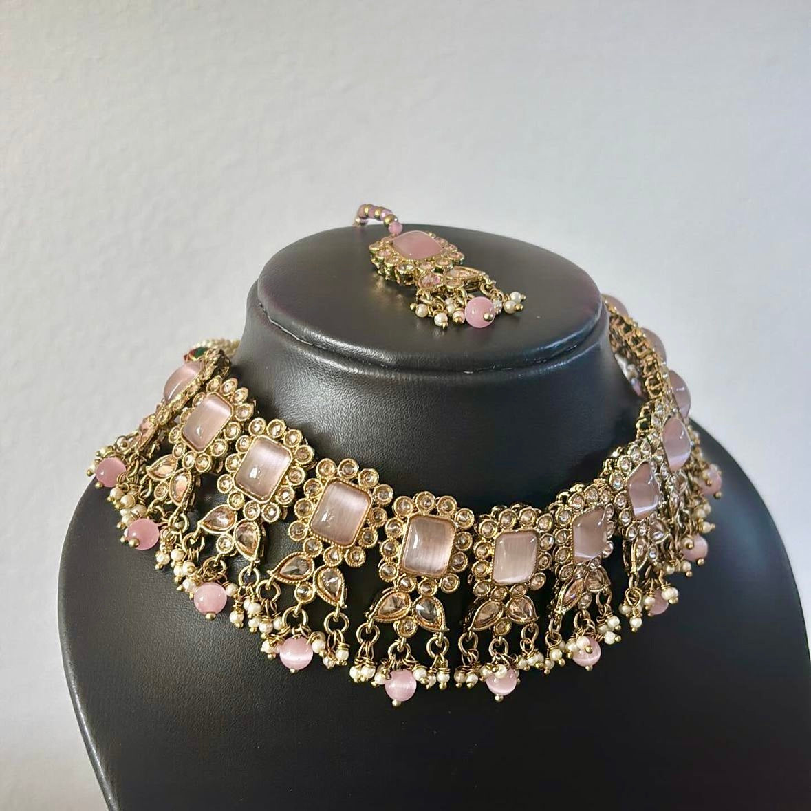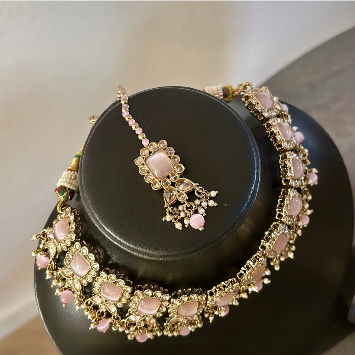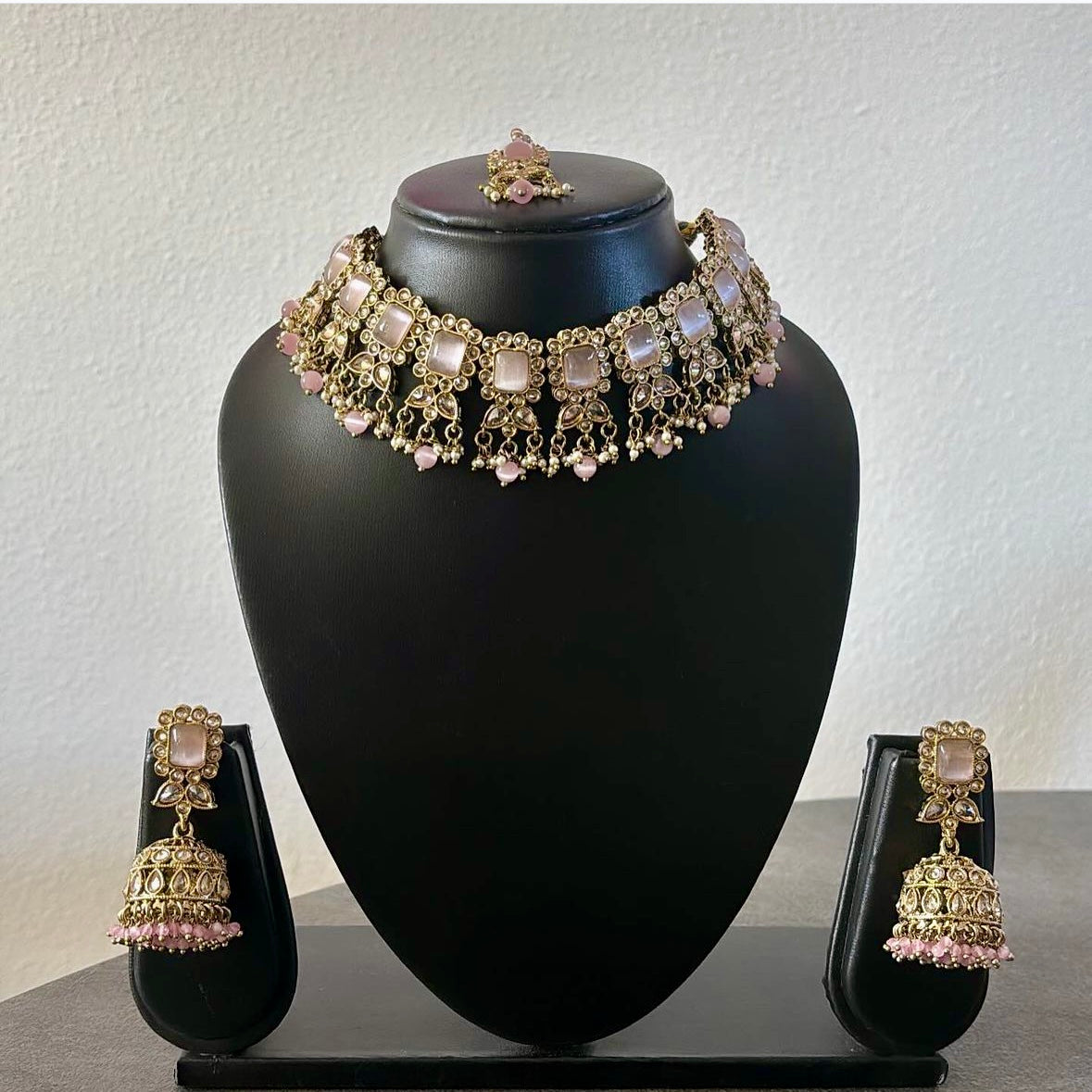 Trending pastel pink stone choker with matching jhumkas and tikka