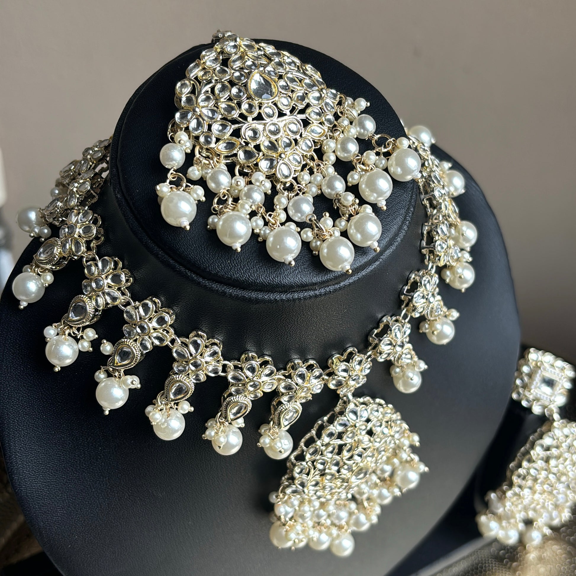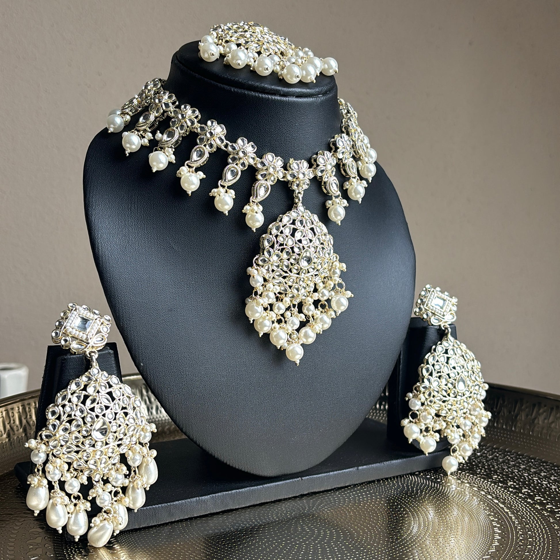 Trending statement kundan short necklace/choker with matching statement earrings and tikka