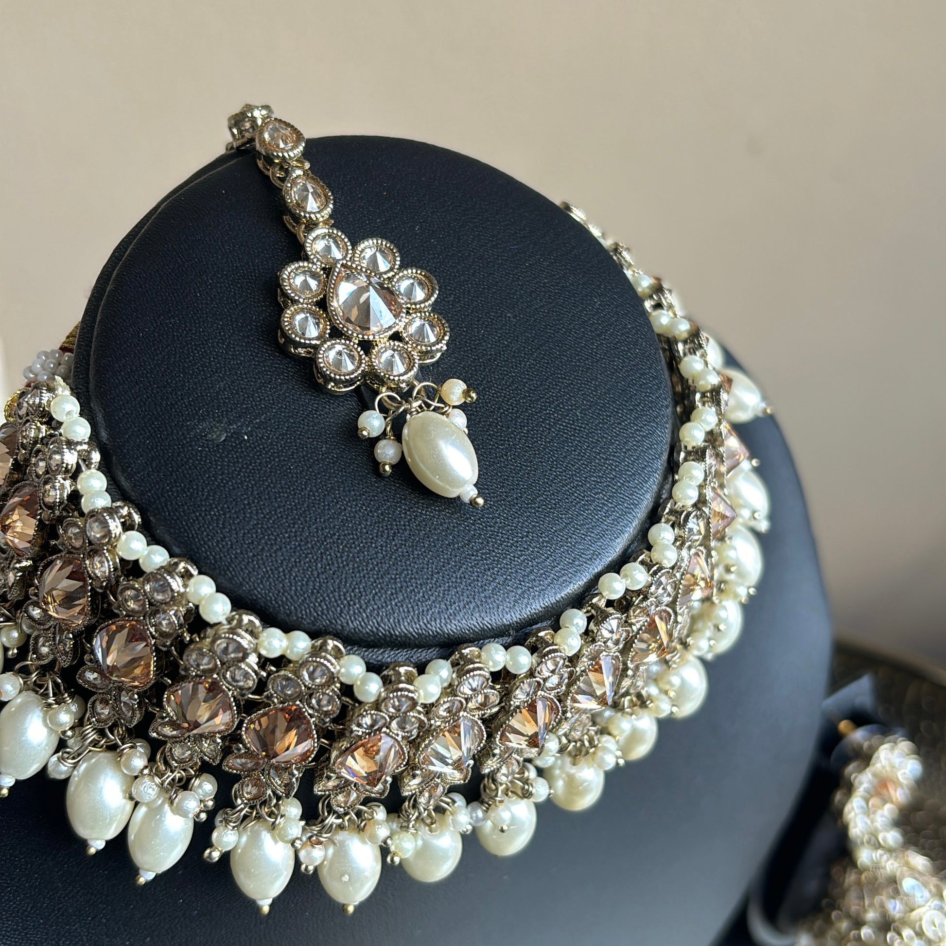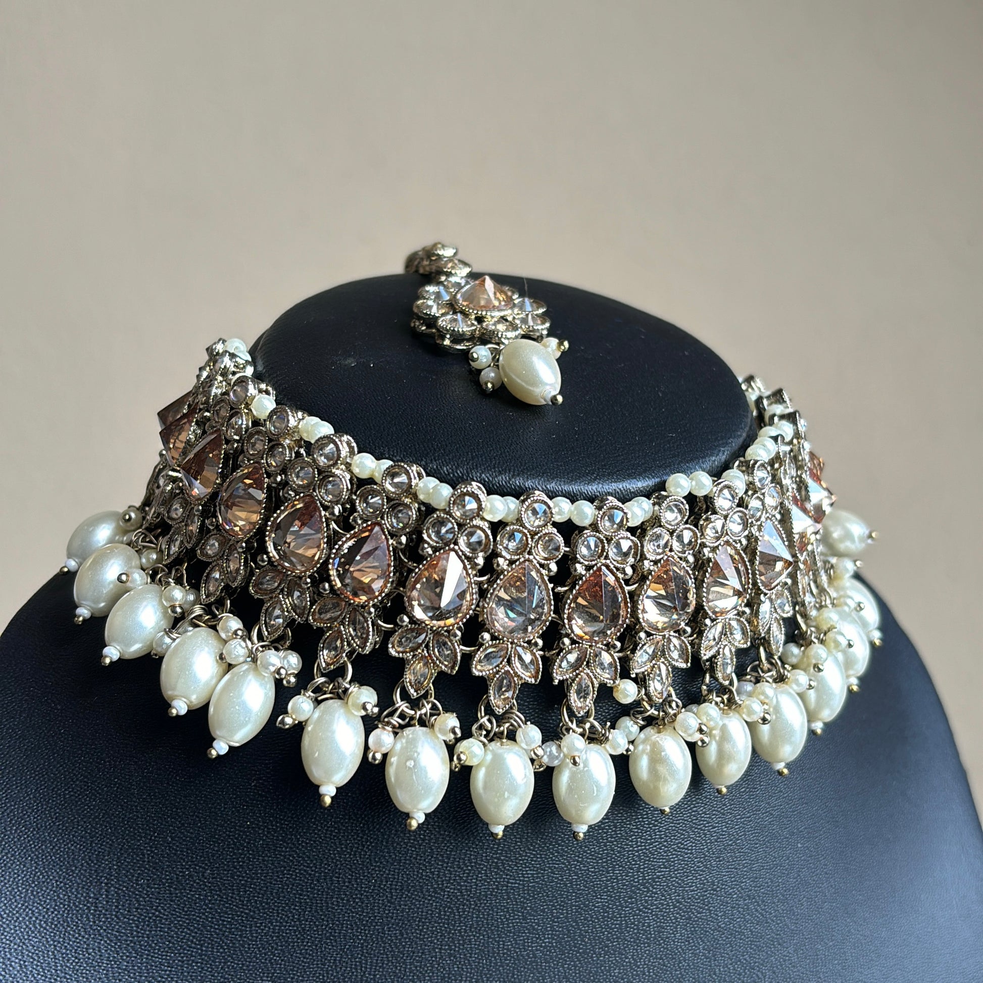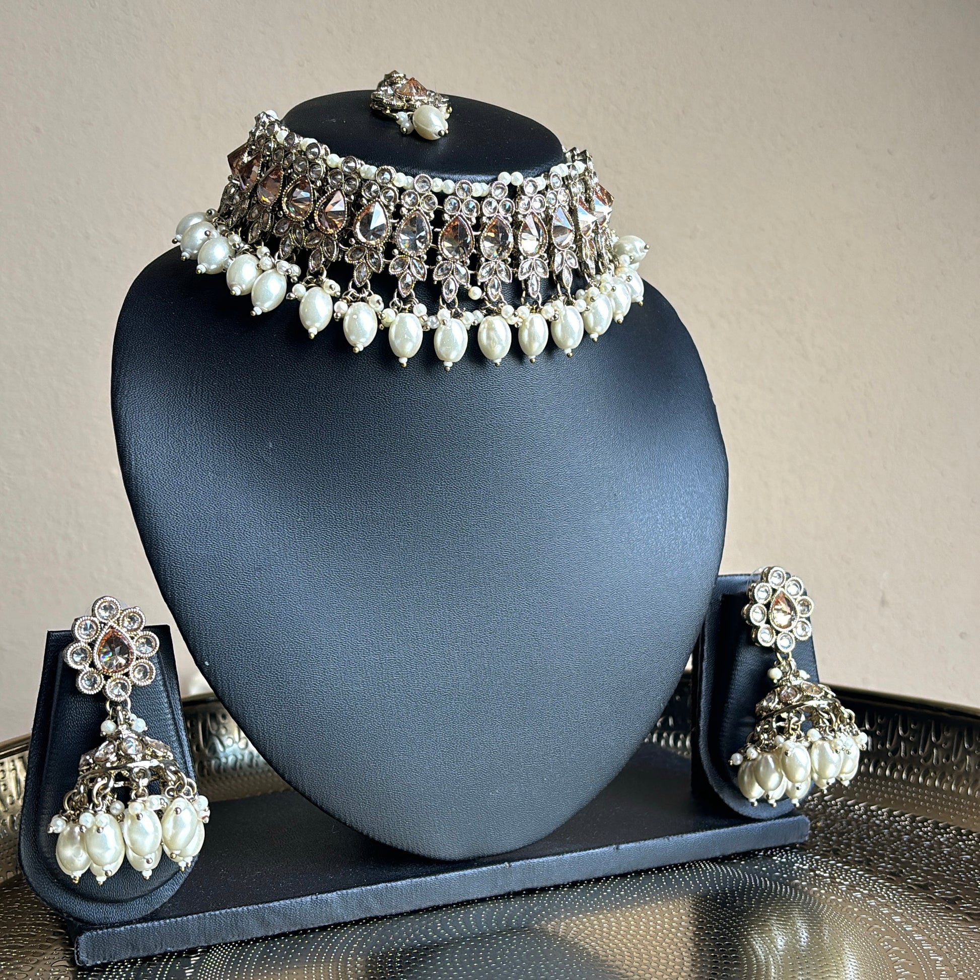 Trending antique gold choker with matching elegant jhumkas and tikka