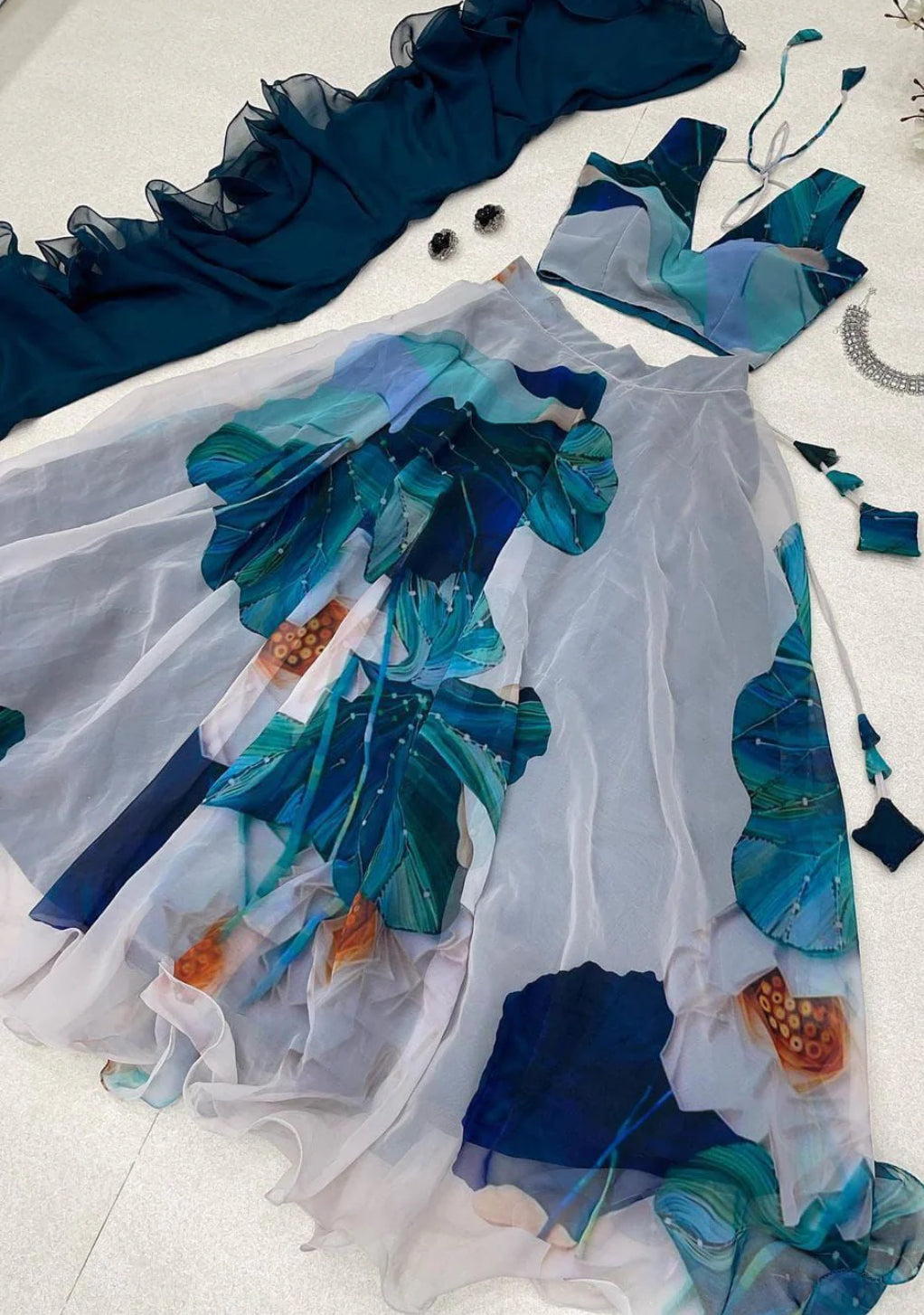 Exclusive readymade pastel blue floral lehenga with matching blouse and dupatta