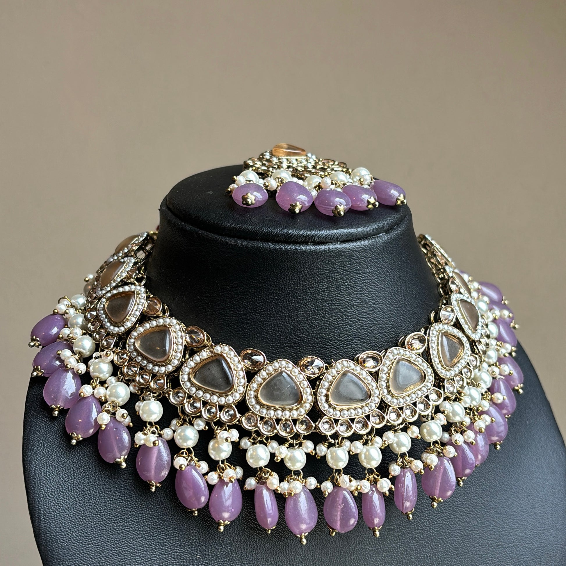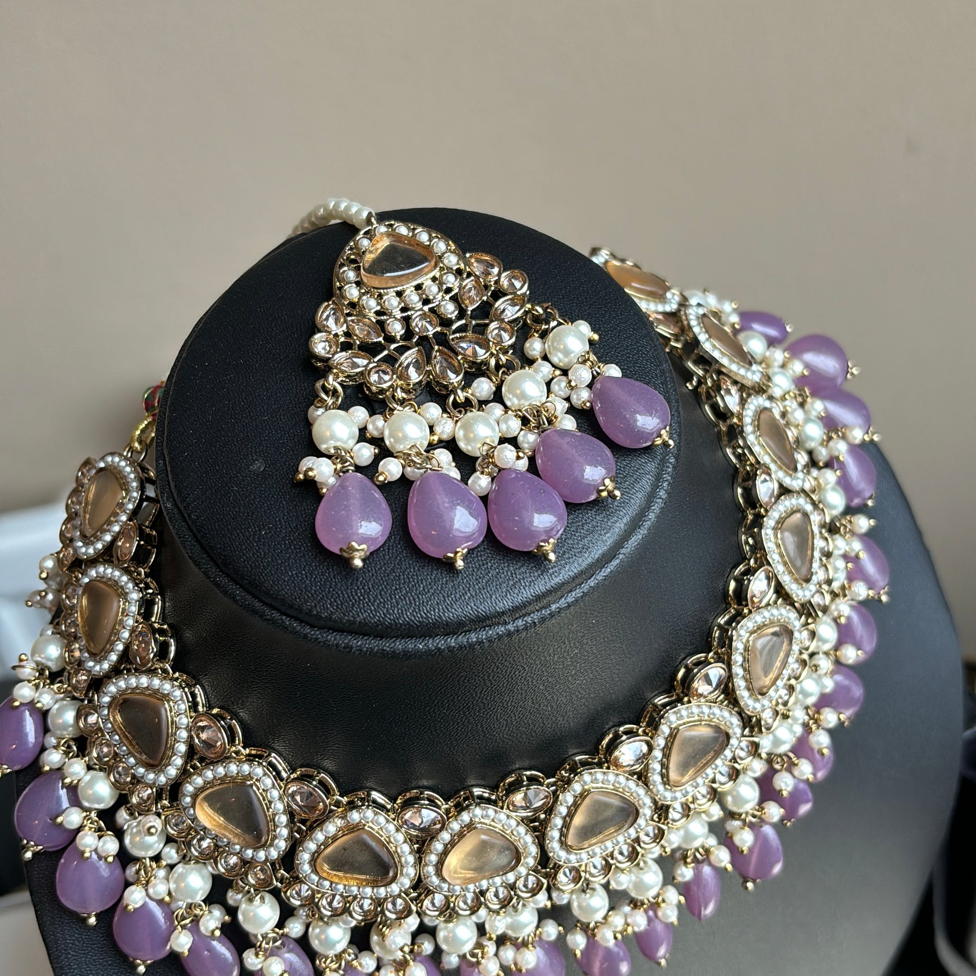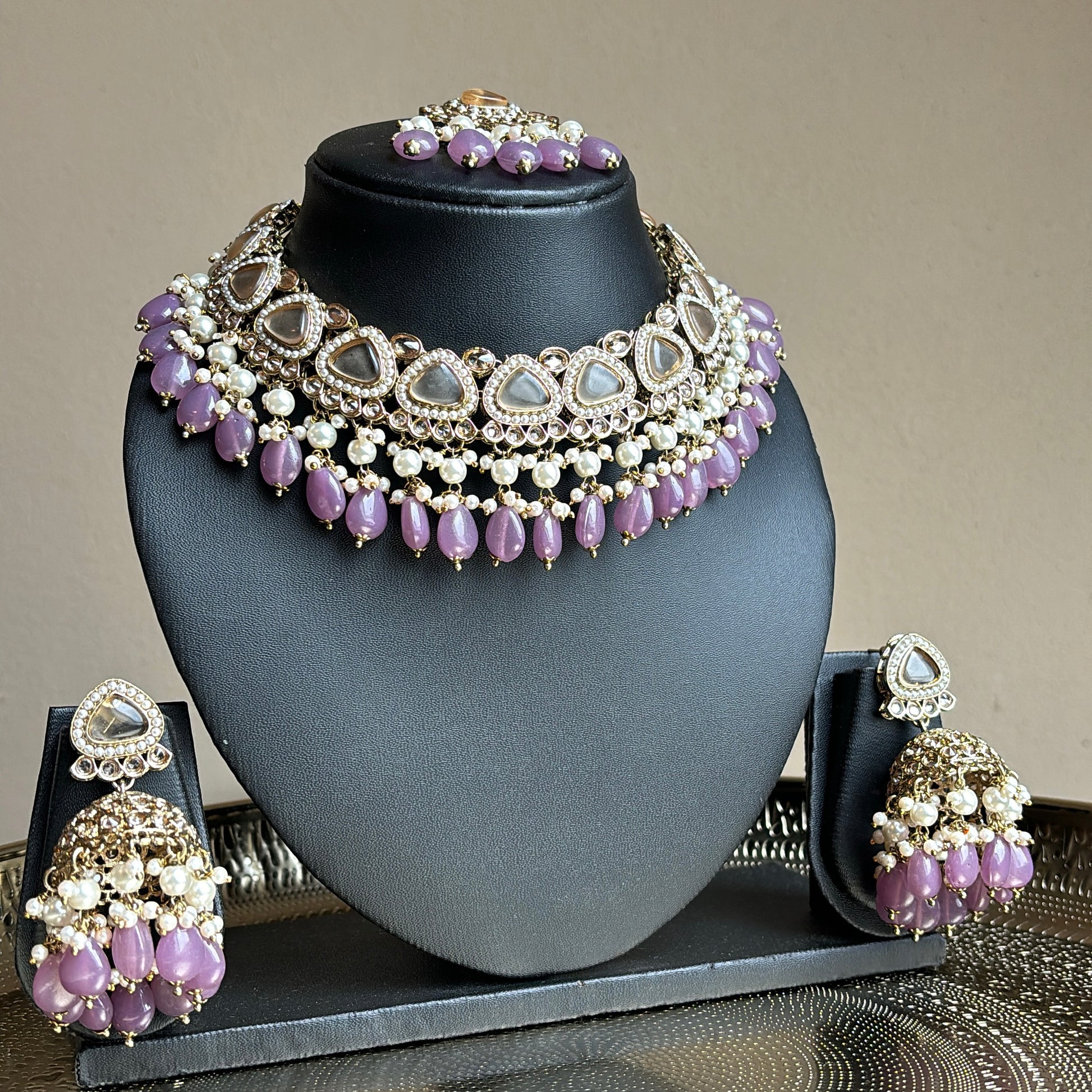 Exclusive mauve nude short necklace with matching statement jhumkas and tikka
