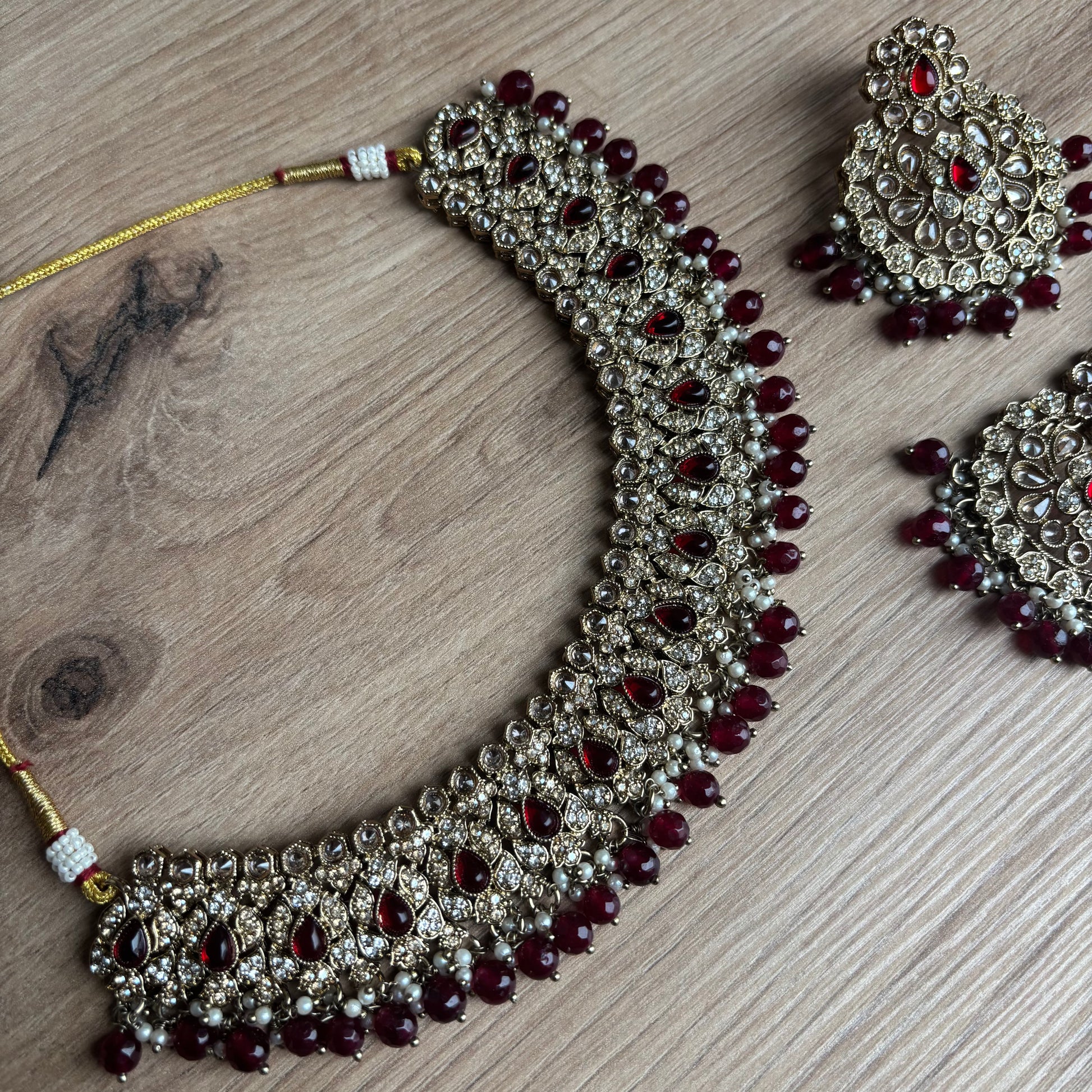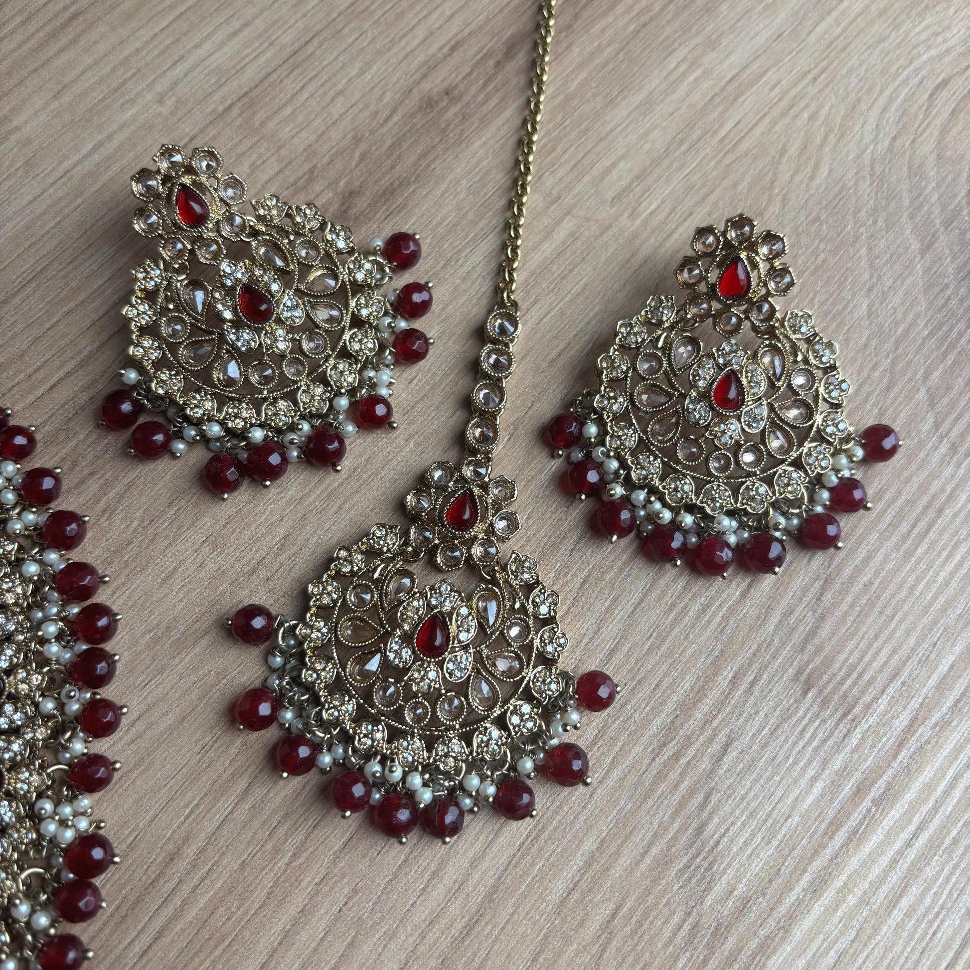 Antique gold statement necklace with maroon details comes with matching earrings and tikka